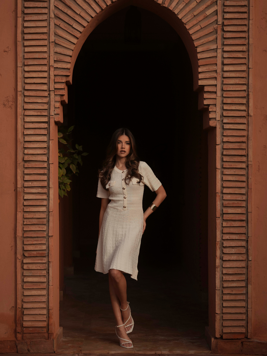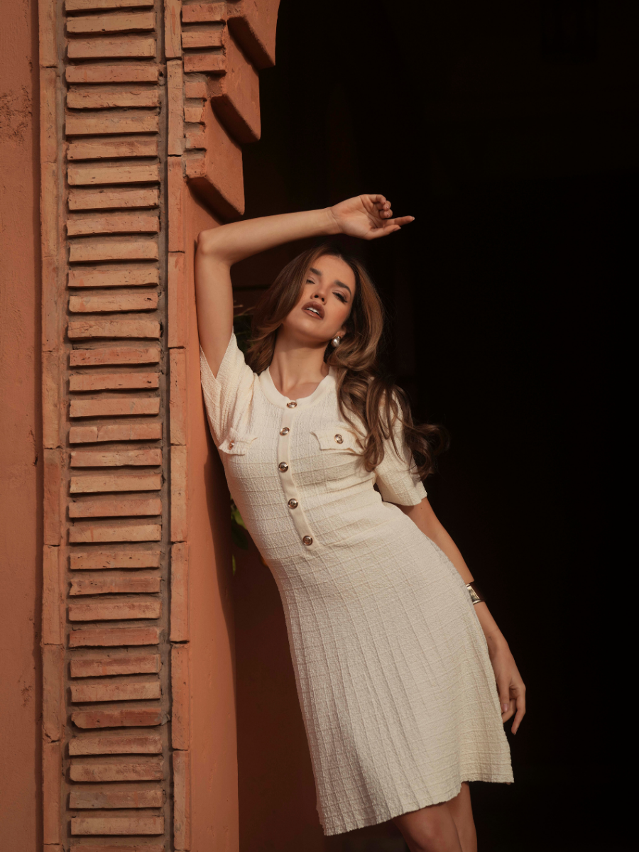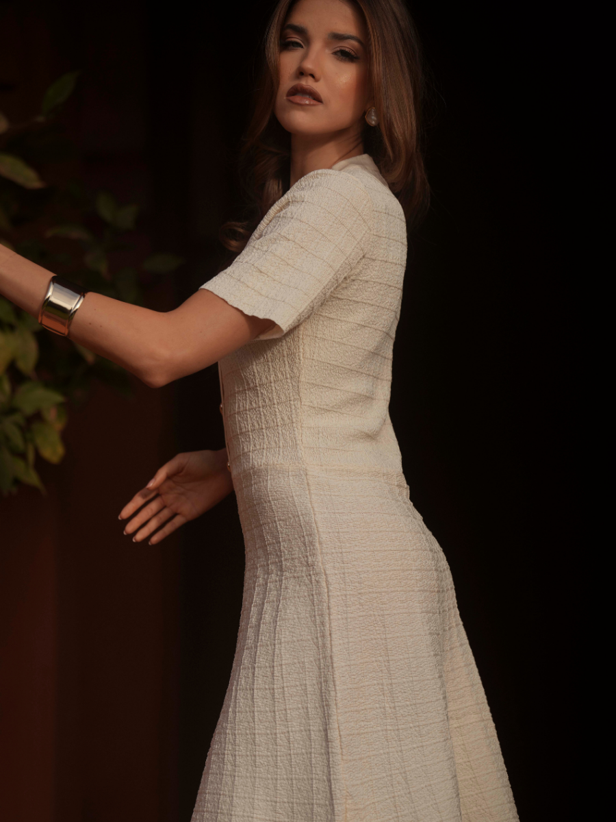 Vestido curto em malha estruturada com padrão canelado e trabalhado. Apresenta gola camiseira clássica e abotoamento frontal com botões dourados decorativos em forma de flor, que acrescentam um toque feminino e delicado. A silhueta ajustada na zona do tronco e fluida a partir da cintura cria um efeito evasé que valoriza a figura. As mangas curtas com acabamento canelado garantem um look sofisticado e versátil, perfeito para ocasiões especiais ou para elevar o dia a dia com um toque de classe.