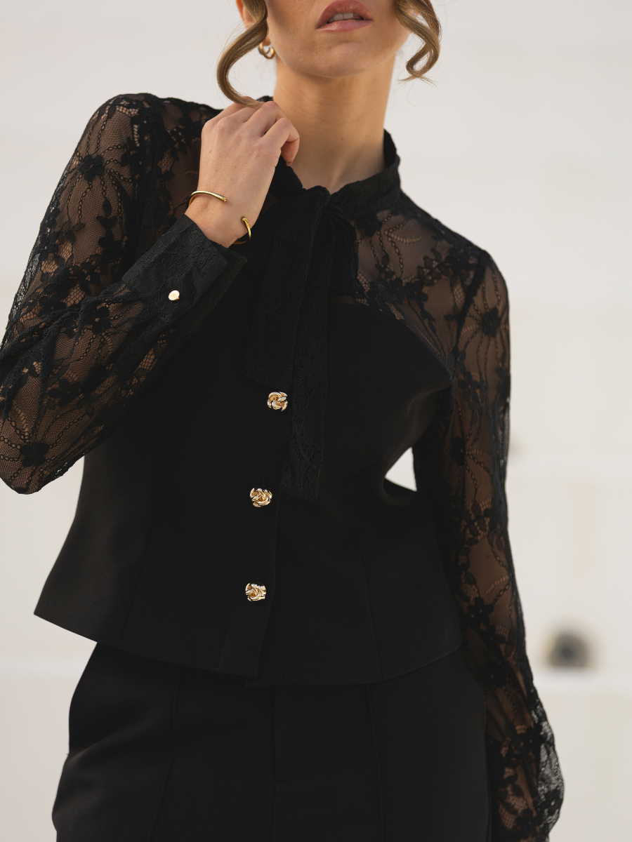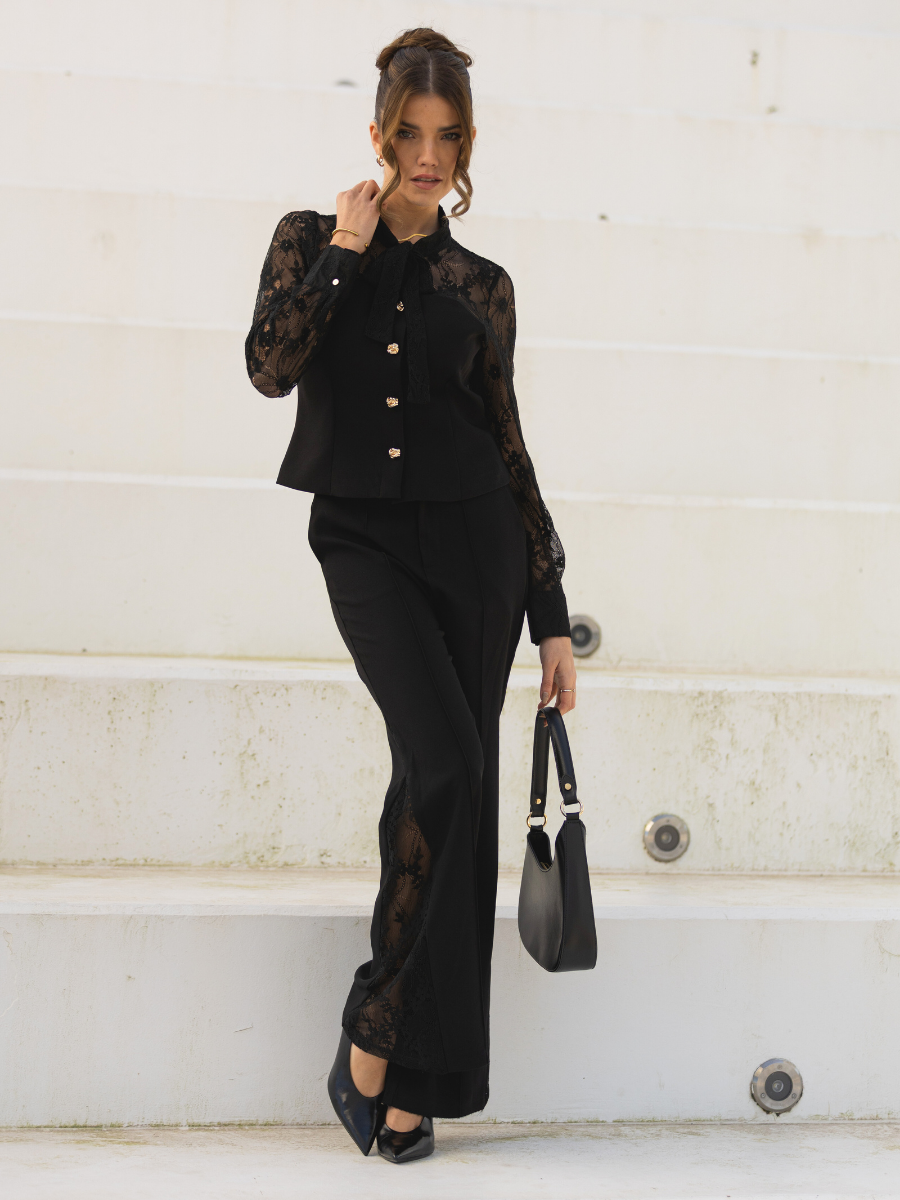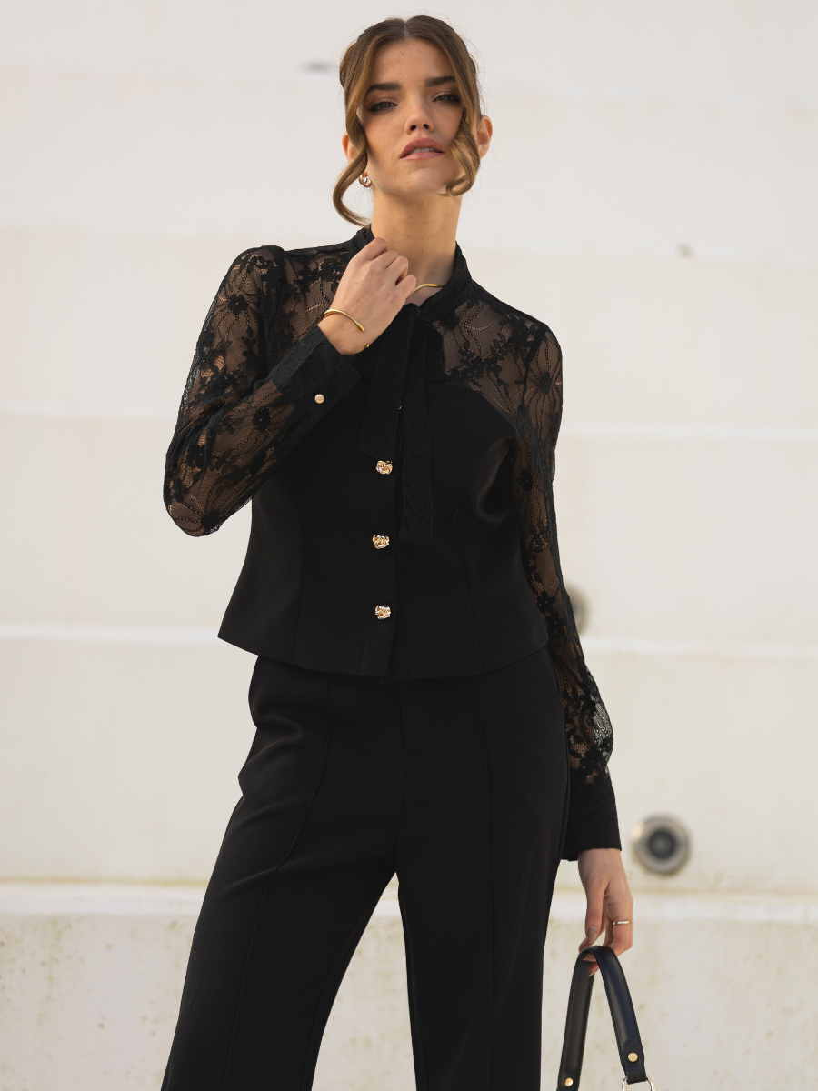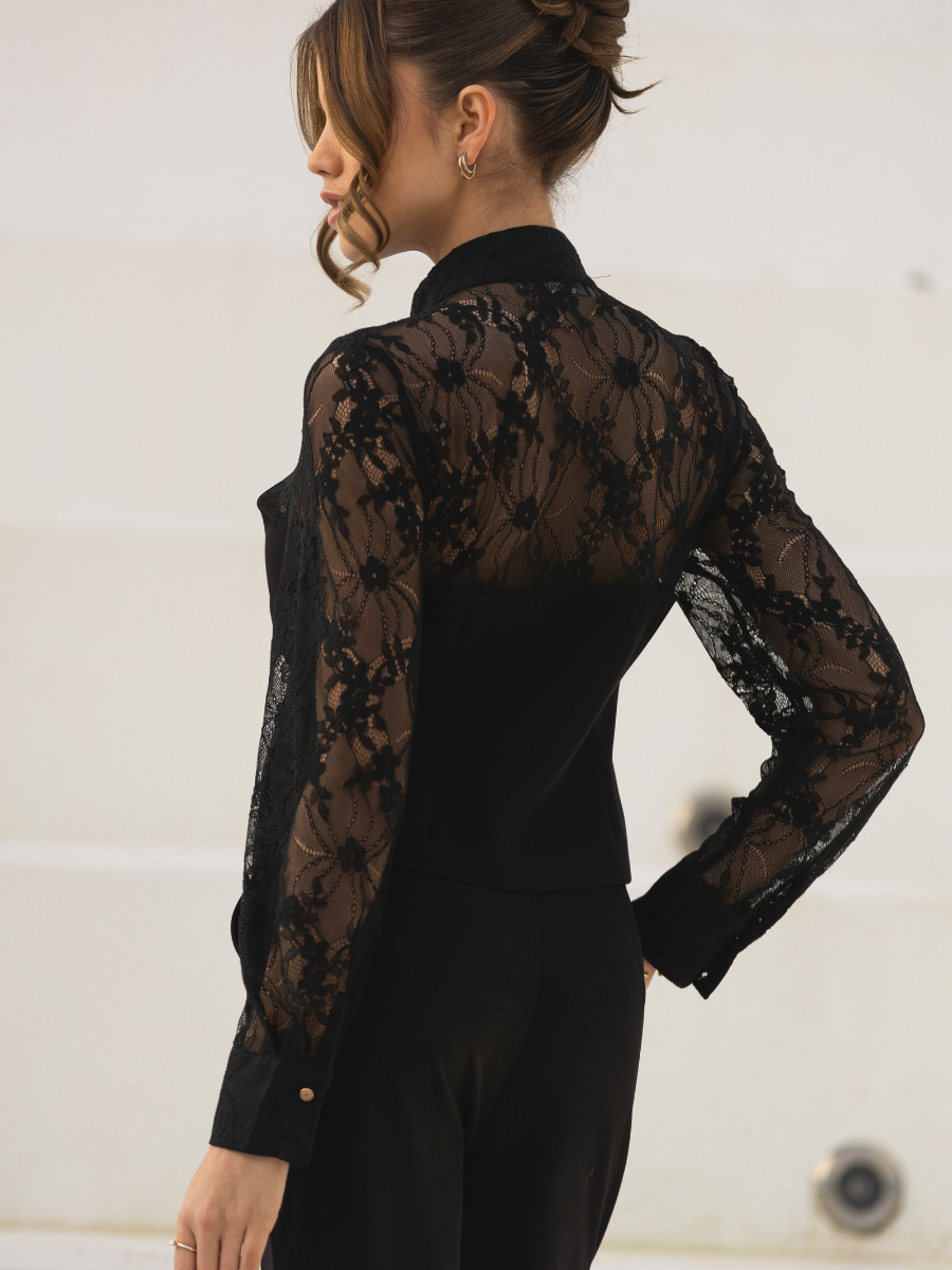 Uma peça sofisticada e impactante para momentos especiais. Esta camisa preta apresenta um elegante laço no colarinho e botões dourados com acabamento floral que acrescentam um toque de requinte. As mangas e costas em renda floral transparente conferem sensualidade e leveza ao look. Os punhos estruturados com botão dourado completam o design delicado e feminino. Ideal para combinar com calças de alfaiataria ou saias para uma ocasião elegante.