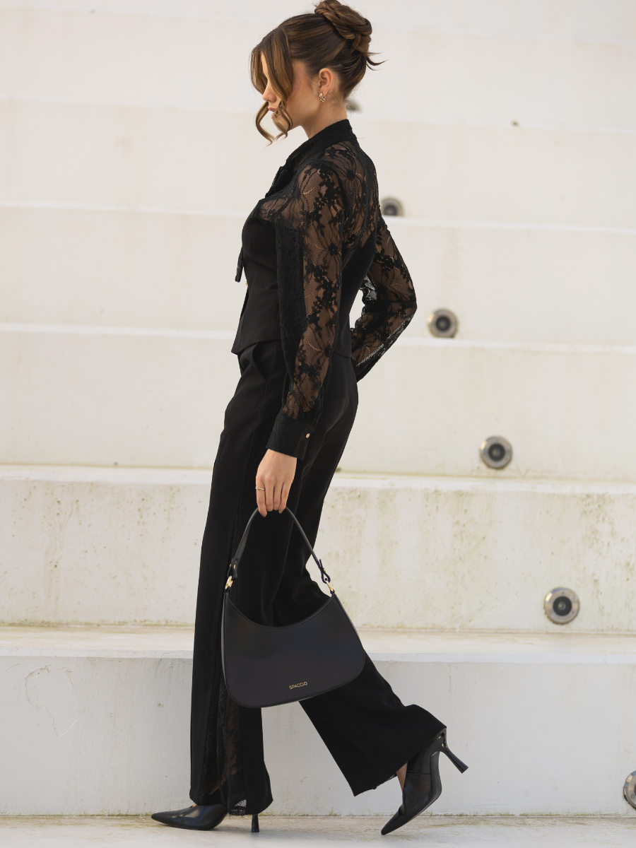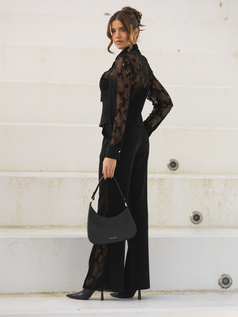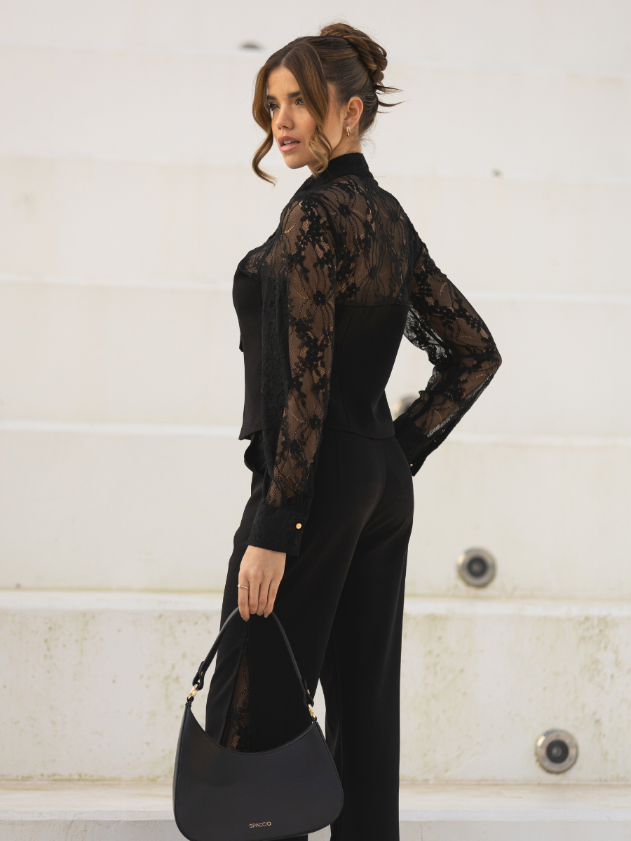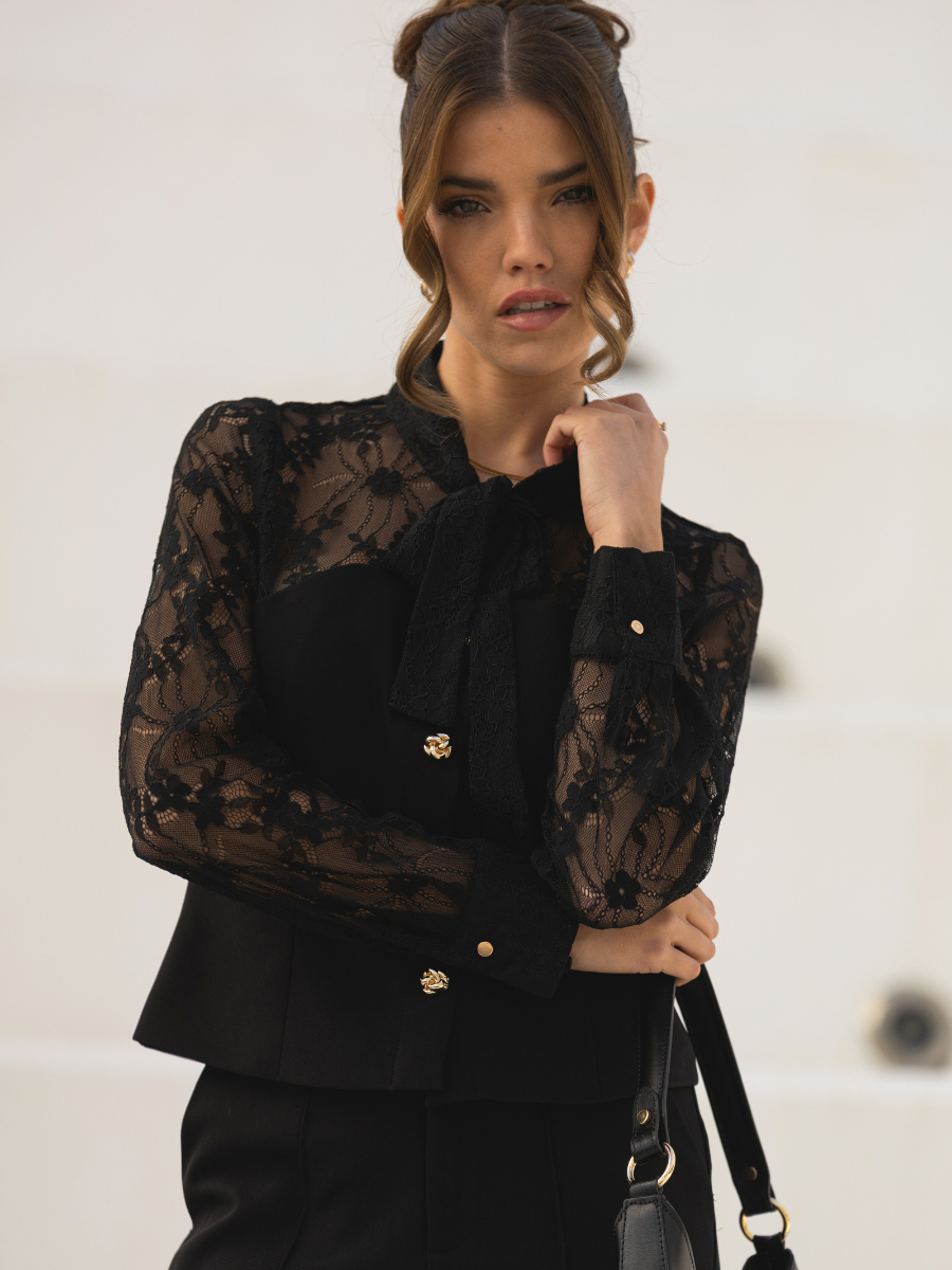 Uma peça sofisticada e impactante para momentos especiais. Esta camisa preta apresenta um elegante laço no colarinho e botões dourados com acabamento floral que acrescentam um toque de requinte. As mangas e costas em renda floral transparente conferem sensualidade e leveza ao look. Os punhos estruturados com botão dourado completam o design delicado e feminino. Ideal para combinar com calças de alfaiataria ou saias para uma ocasião elegante.