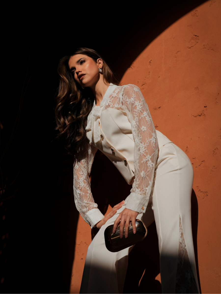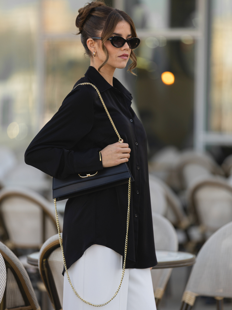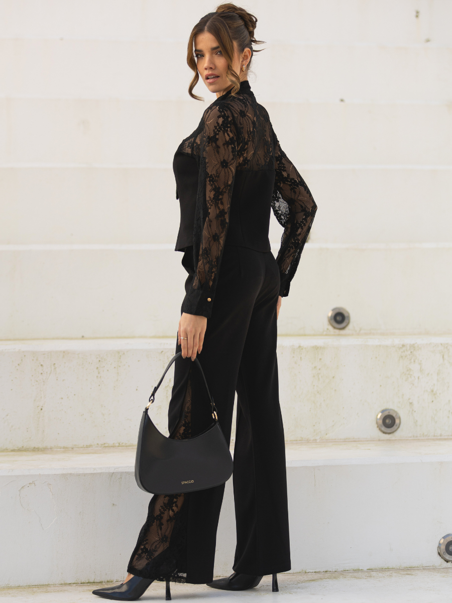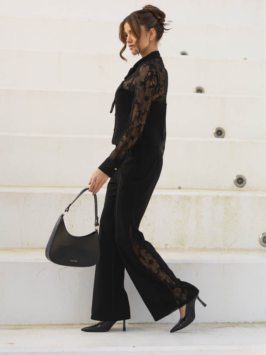 Uma peça sofisticada e impactante para momentos especiais. Esta camisa preta apresenta um elegante laço no colarinho e botões dourados com acabamento floral que acrescentam um toque de requinte. As mangas e costas em renda floral transparente conferem sensualidade e leveza ao look. Os punhos estruturados com botão dourado completam o design delicado e feminino. Ideal para combinar com calças de alfaiataria ou saias para uma ocasião elegante.