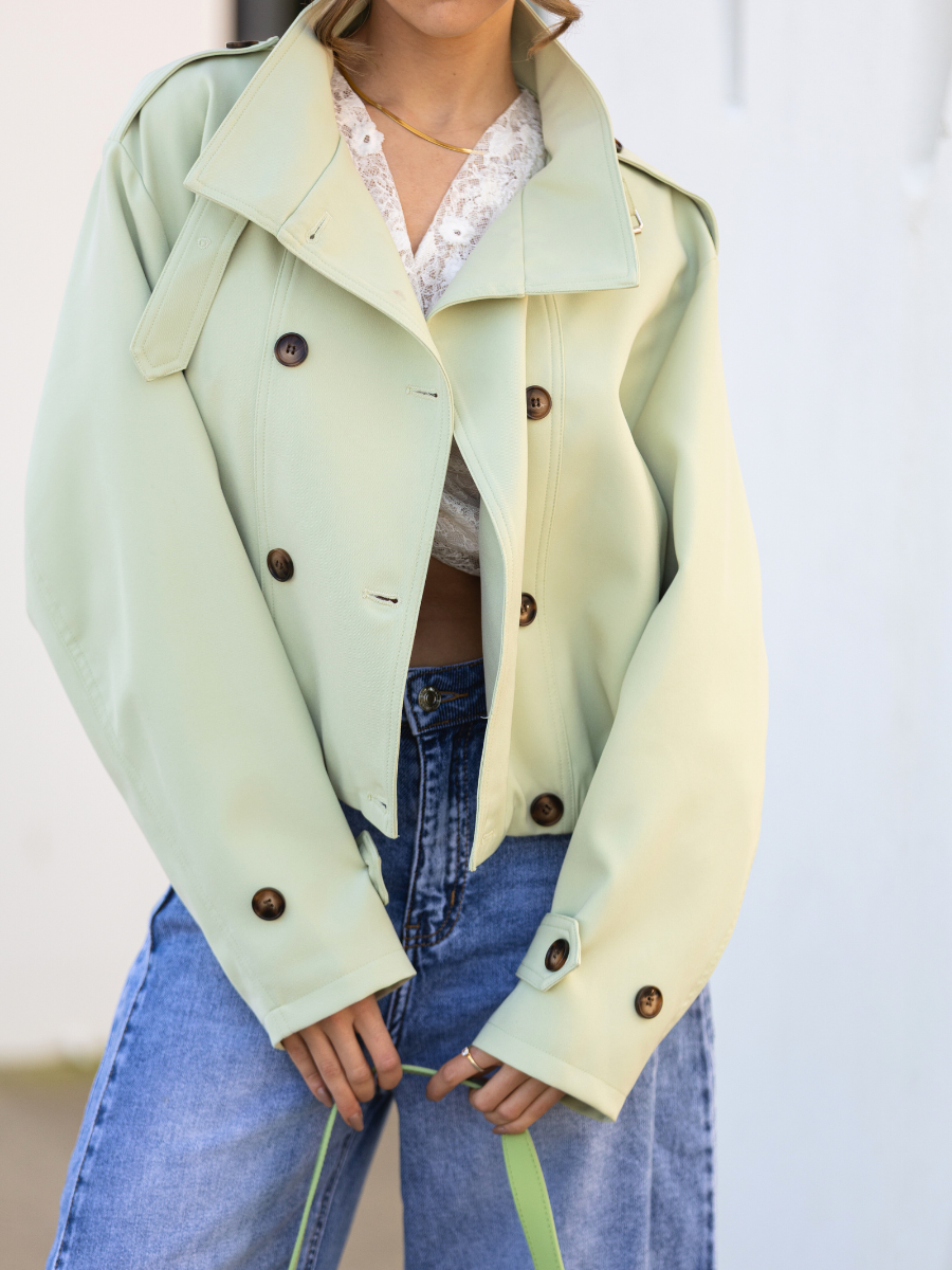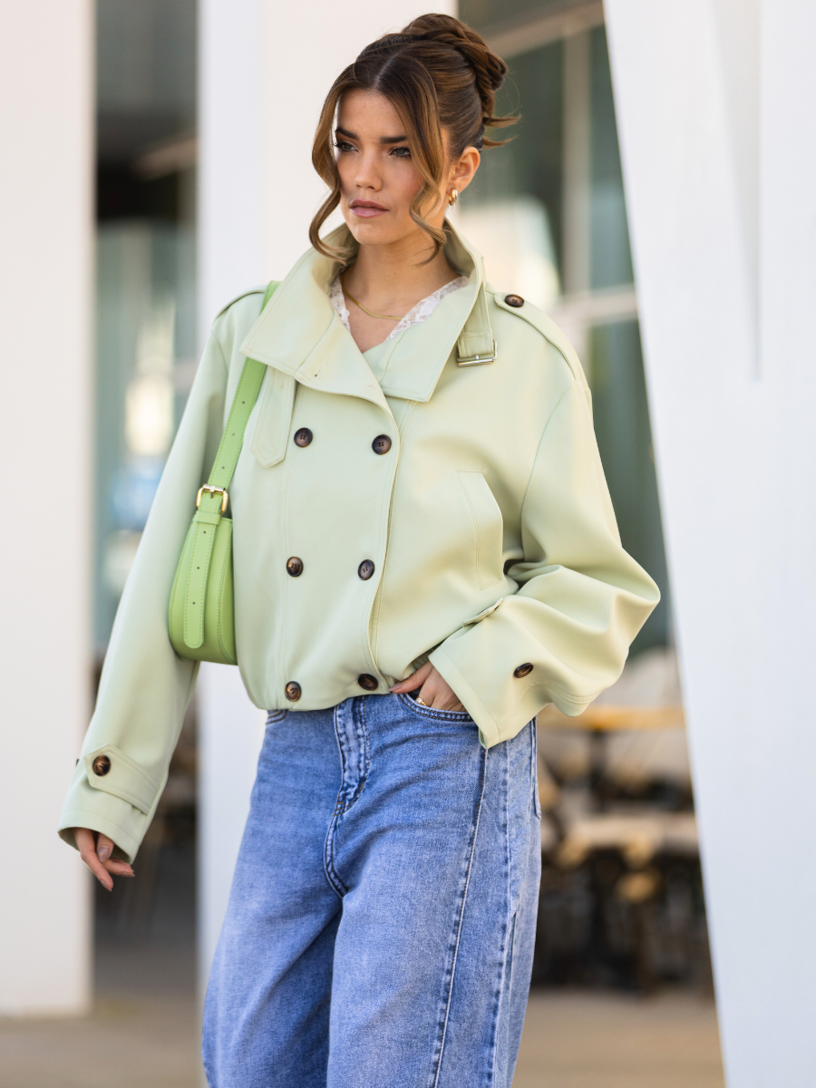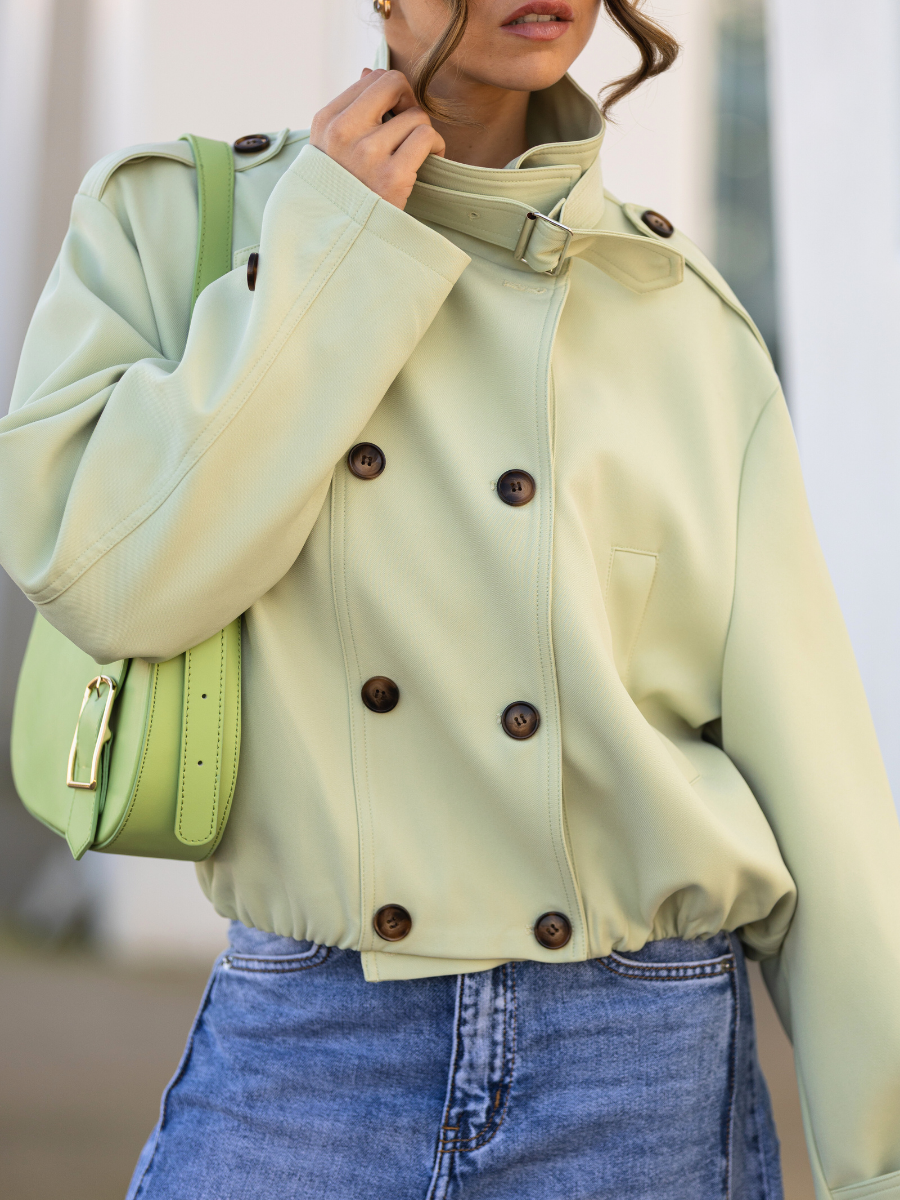 Casaco curto em efeito pele verde-menta, com botão duplo frontal, punhos ajustáveis, gola alta com fivela e acabamento elástico na cintura. Modelo tendência para um look urbano e sofisticado.