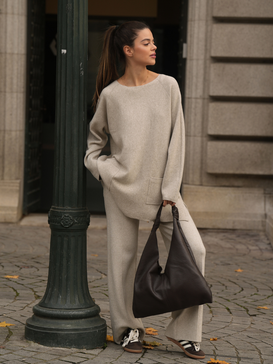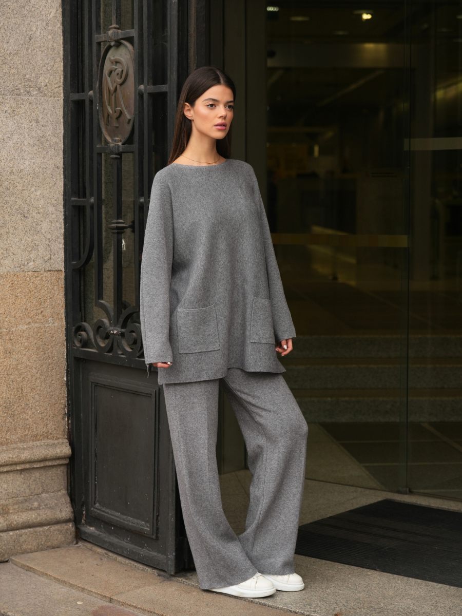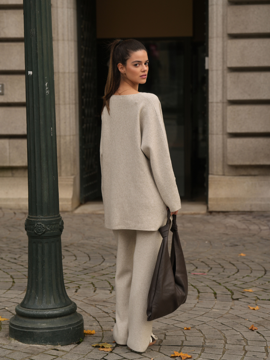 Minimalista, confortável e sofisticado — este conjunto de malha premium é o essencial elegante para os teus dias. Composto por camisola de manga comprida e calças de cintura subida com corte reto, adapta-se a visuais casuais ou mais arranjados com facilidade.