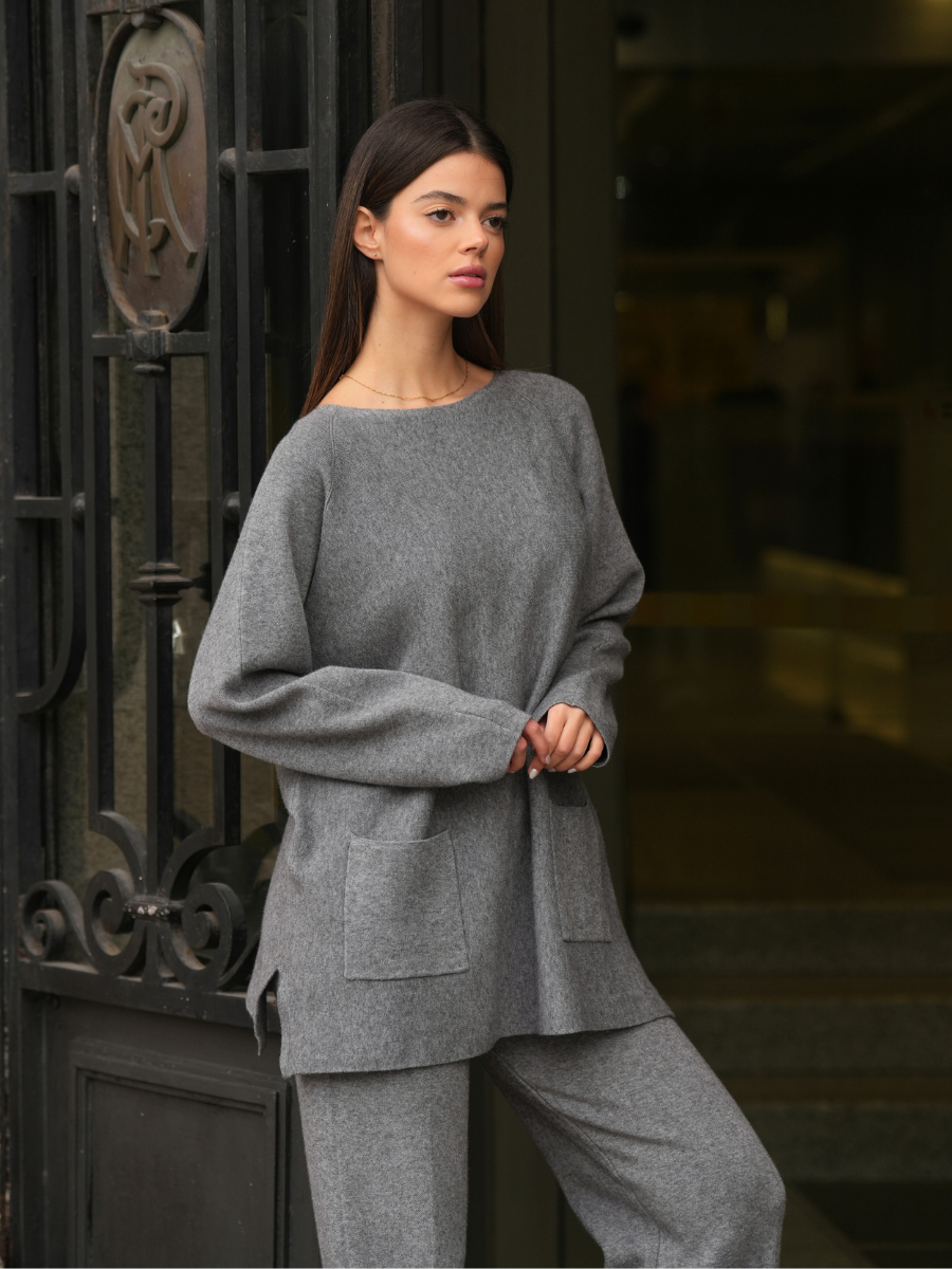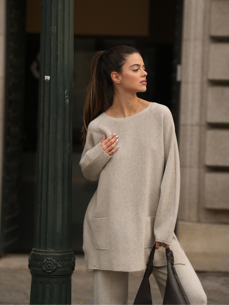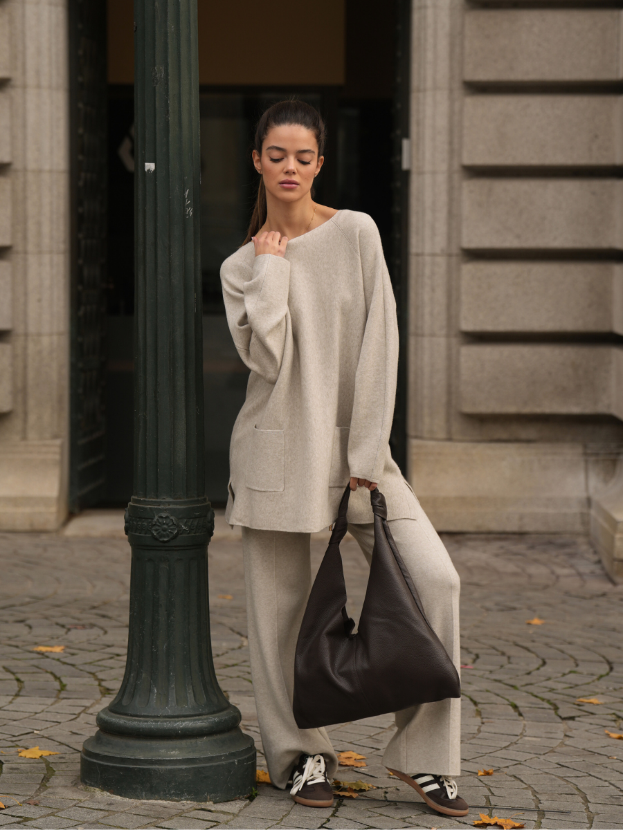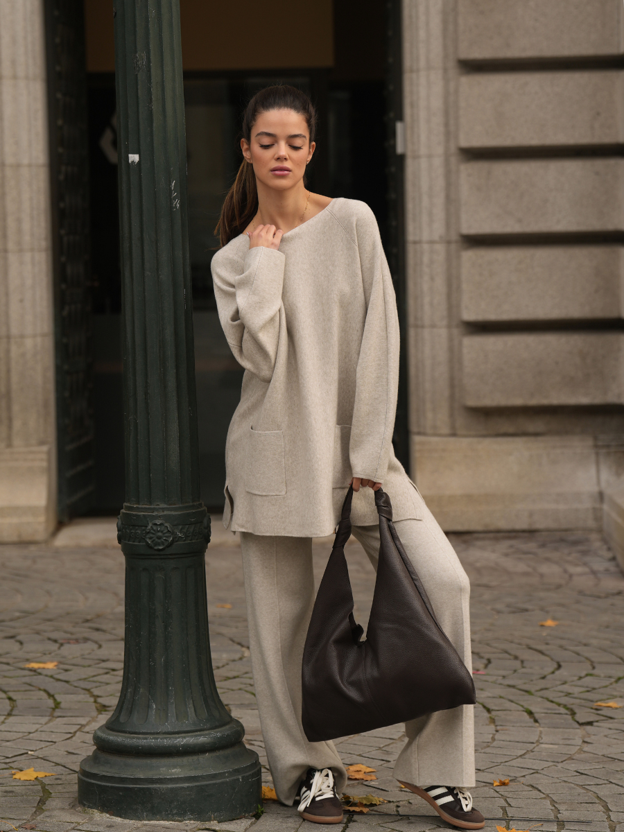 Minimalista, confortável e sofisticado — este conjunto de malha premium é o essencial elegante para os teus dias. Composto por camisola de manga comprida e calças de cintura subida com corte reto, adapta-se a visuais casuais ou mais arranjados com facilidade.