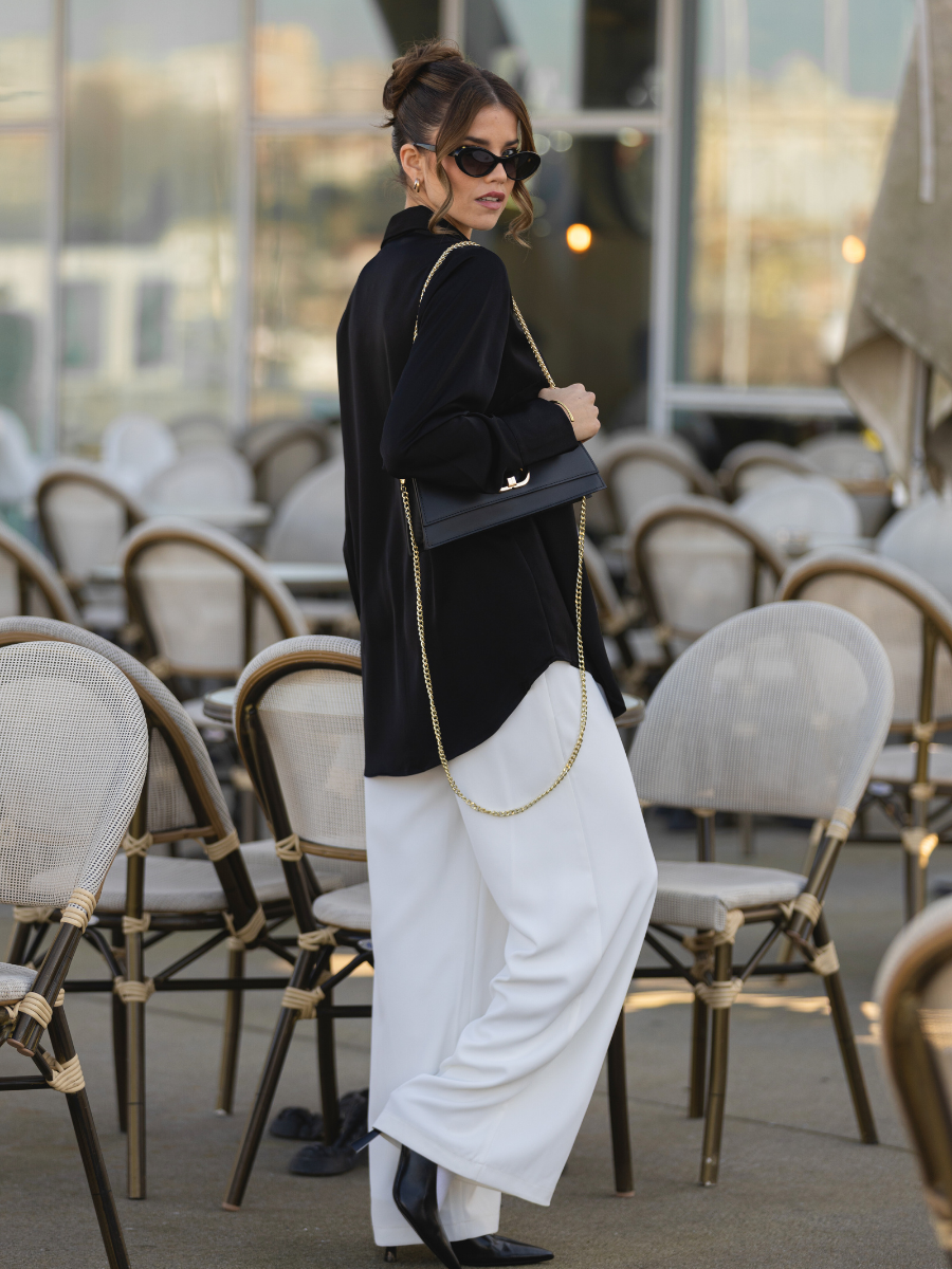 Macacão curto com blusa branca integrada, gola clássica e manga comprida com botão no punho. Parte inferior preta com pinças frontais e acabamento fluido. Elegante, versátil e ideal para compor looks urbanos ou sofisticados.