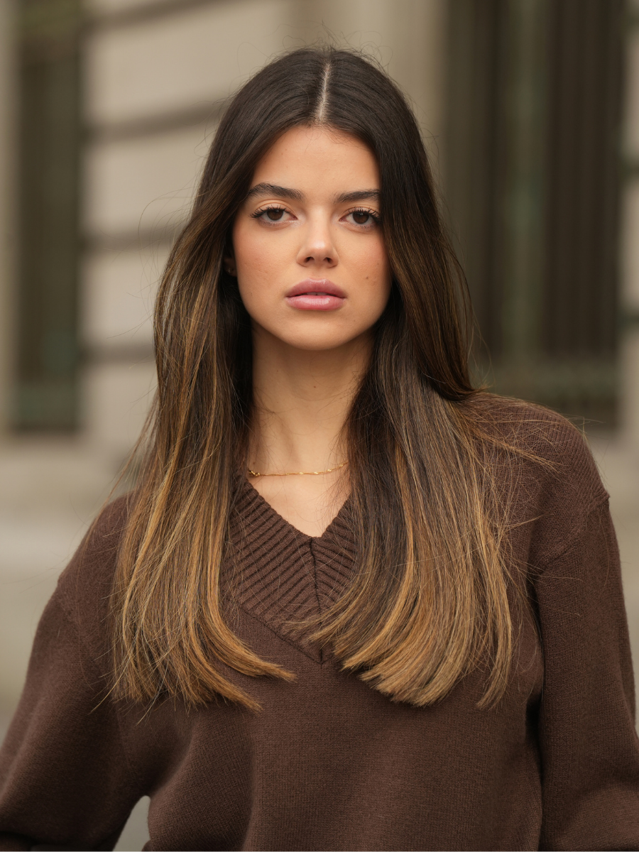 Com um toque moderno e um corte que favorece a silhueta, esta camisola canelada em malha elástica destaca-se pelas riscas castanhas e bege em contraste. As mangas em godé criam um efeito visual marcante, com padrão diagonal que quebra a horizontalidade da peça. O design justo ao corpo, com gola subida, torna-a ideal para conjugar com jeans ou calças de cintura subida.
