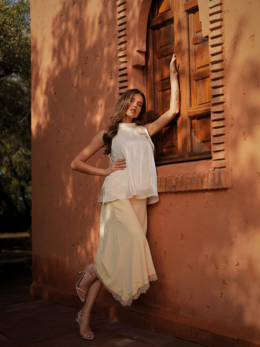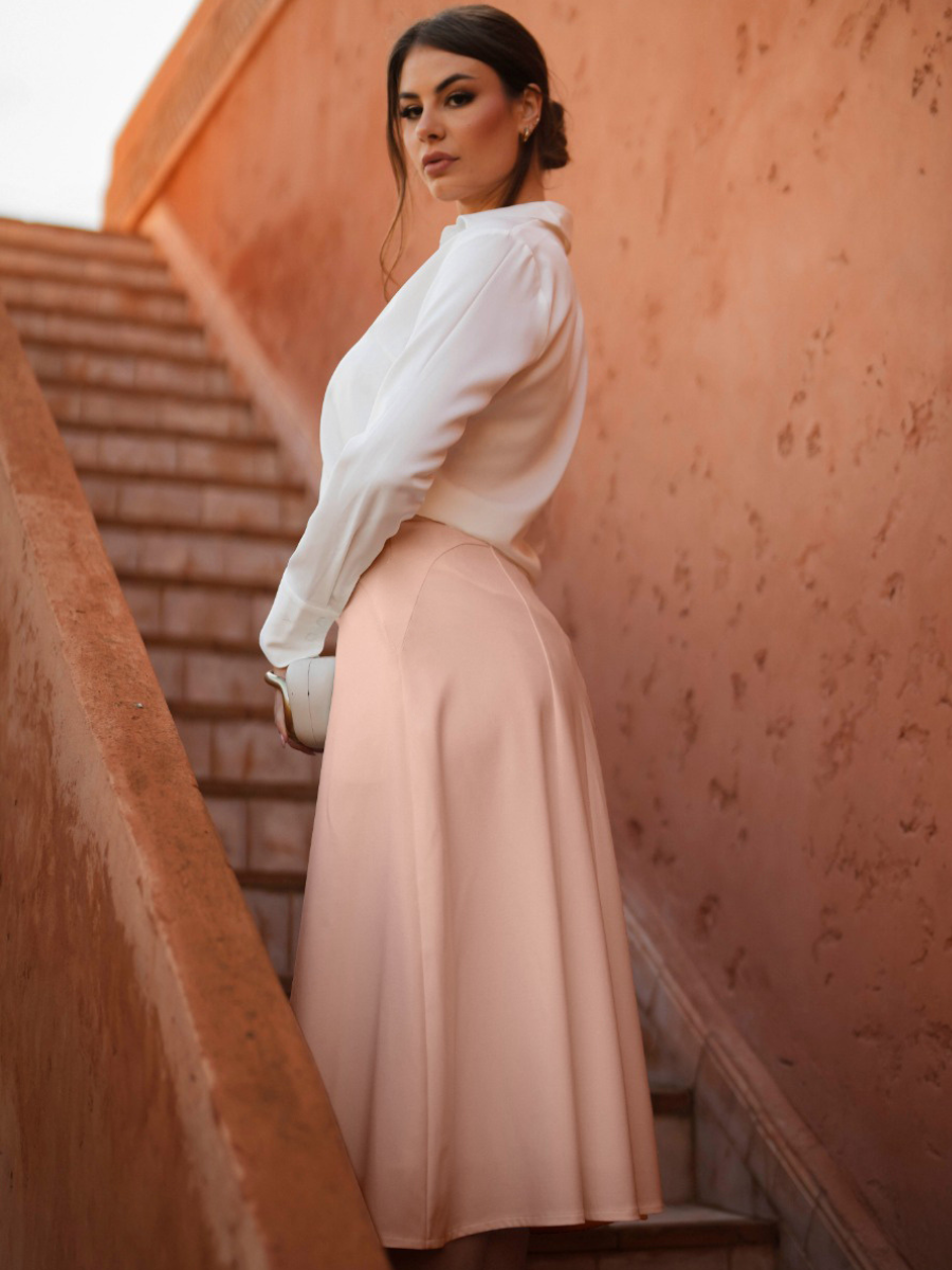 Saia midi de corte fluido com design minimalista e elegante. A cintura subida valoriza a silhueta, enquanto o volume suave cria um movimento leve e feminino. Ideal para combinar com o casaco a condizer ou com peças mais simples, adaptando-se facilmente a diferentes ocasiões.