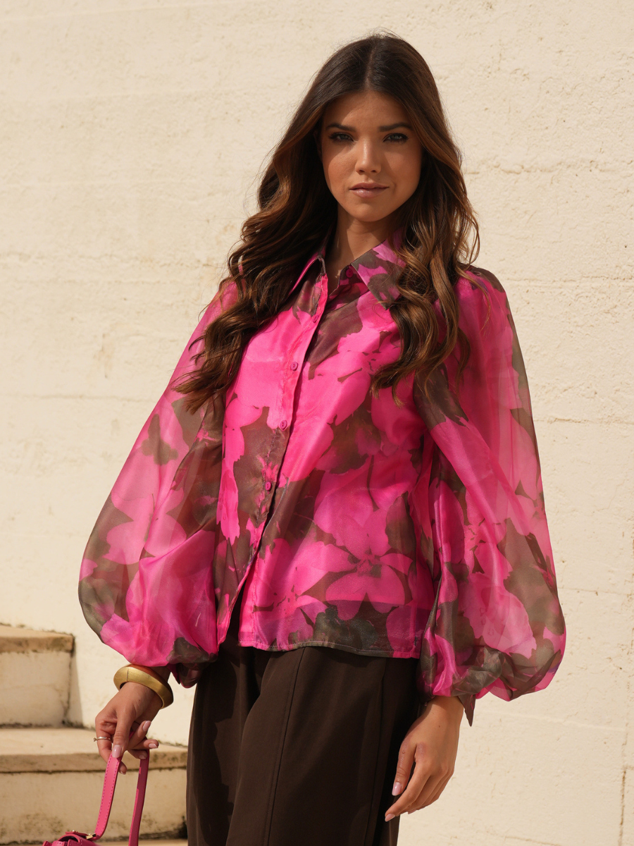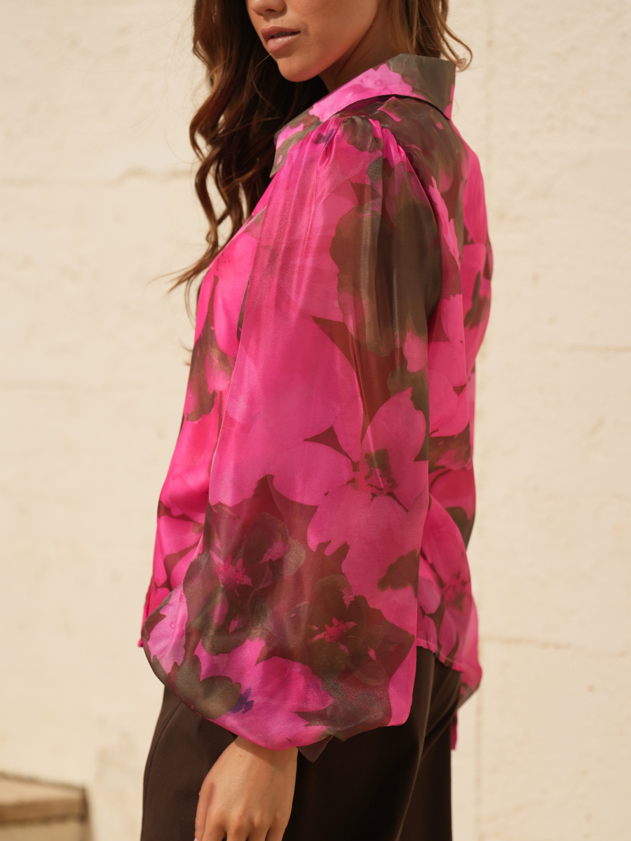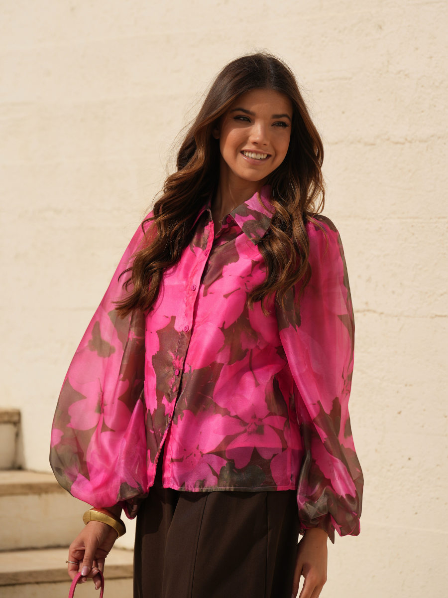 Camisa em tecido leve e fluido com estampa floral marcante em tons de fúcsia.