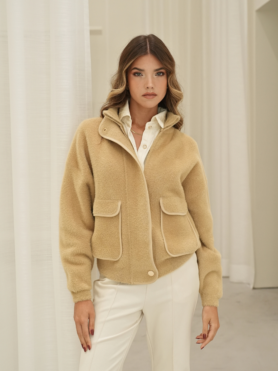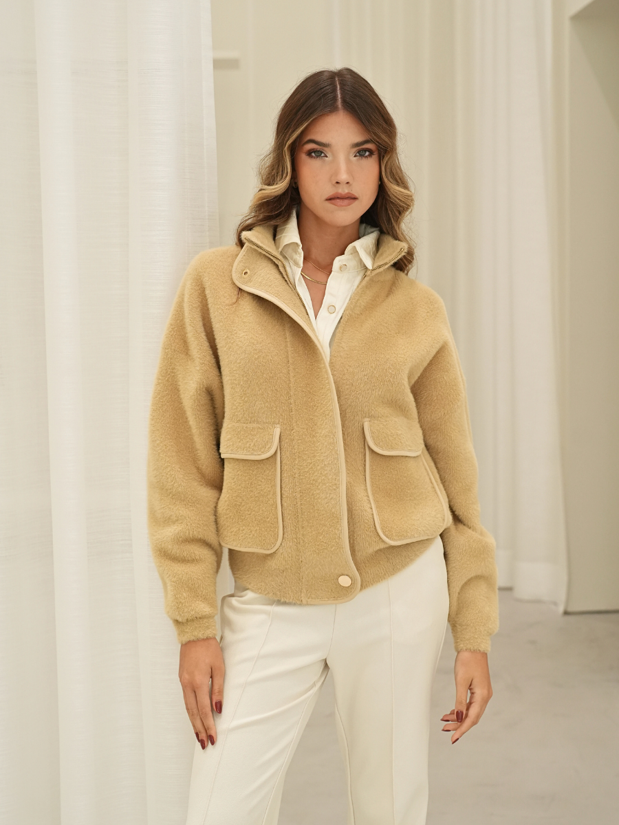 Casaco bomber curto em tecido efeito pelo, com toque macio e visual cozy. Modelo com gola alta estruturada, fecho frontal oculto por com botão de pressão, bolsos de aba aplicados à frente e acabamento em vivo contrastante no mesmo tom. Punhos e cós com elástico leve para ajuste confortável. Interior forrado. Uma peça versátil e elegante, perfeita para os dias mais frios.