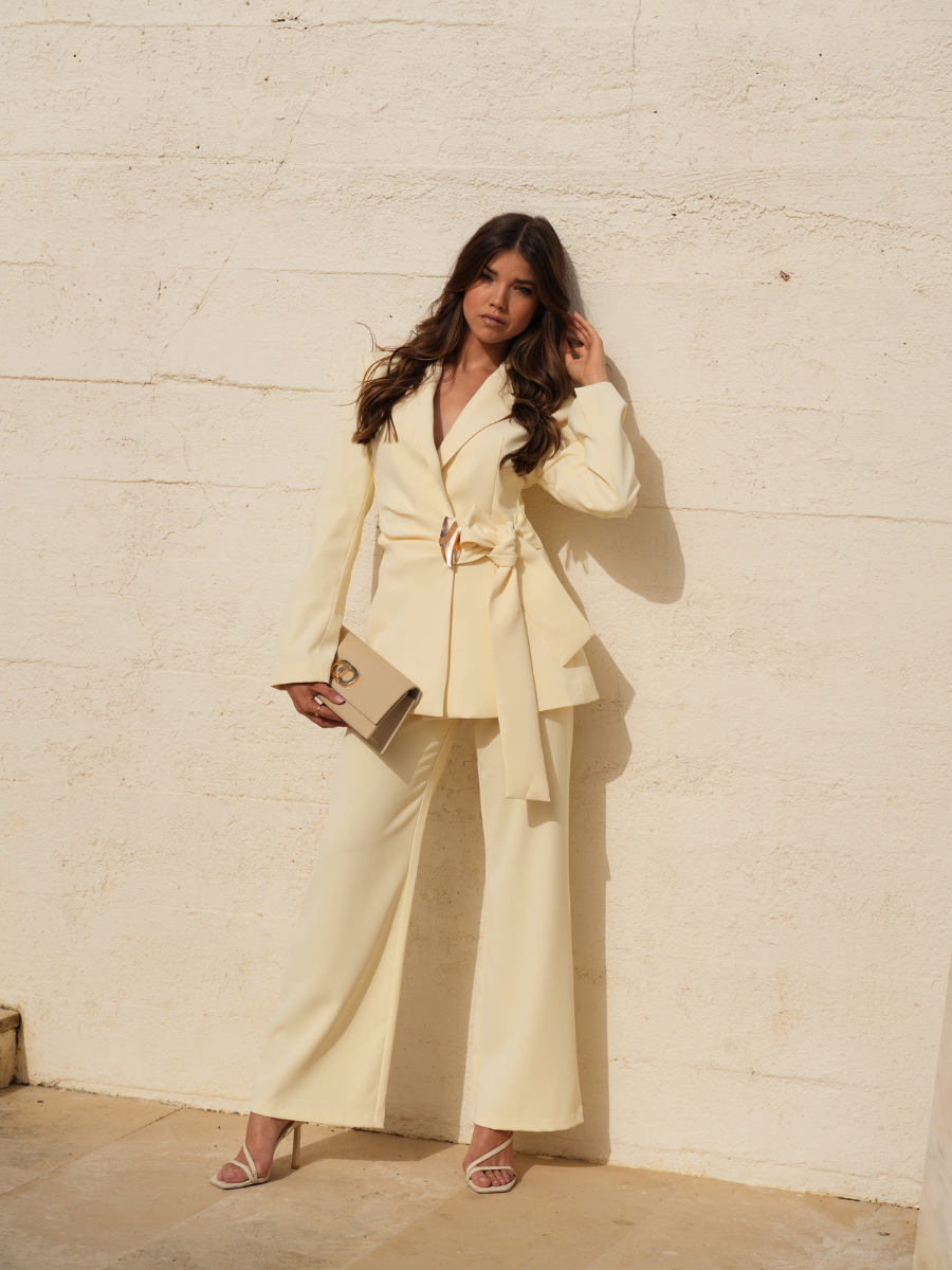 Macacão comprido de corte sofisticado com parte superior fluida e cintura marcada. As calças de perna larga criam um efeito elegante e alongado, ideal para ocasiões especiais ou looks modernos do dia a dia.