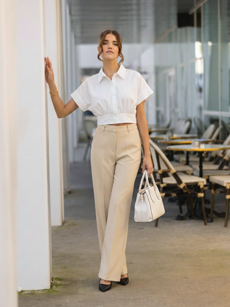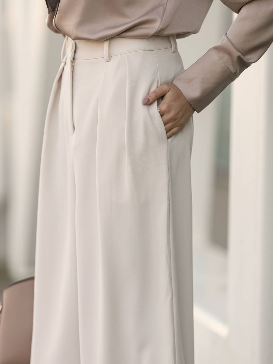 Com um corte clássico e elegante, estas calças bege de alfaiataria são a escolha perfeita para compor looks sofisticados e modernos. O design de cintura subida valoriza a silhueta, enquanto a perna larga proporciona movimento e conforto ao longo do dia.