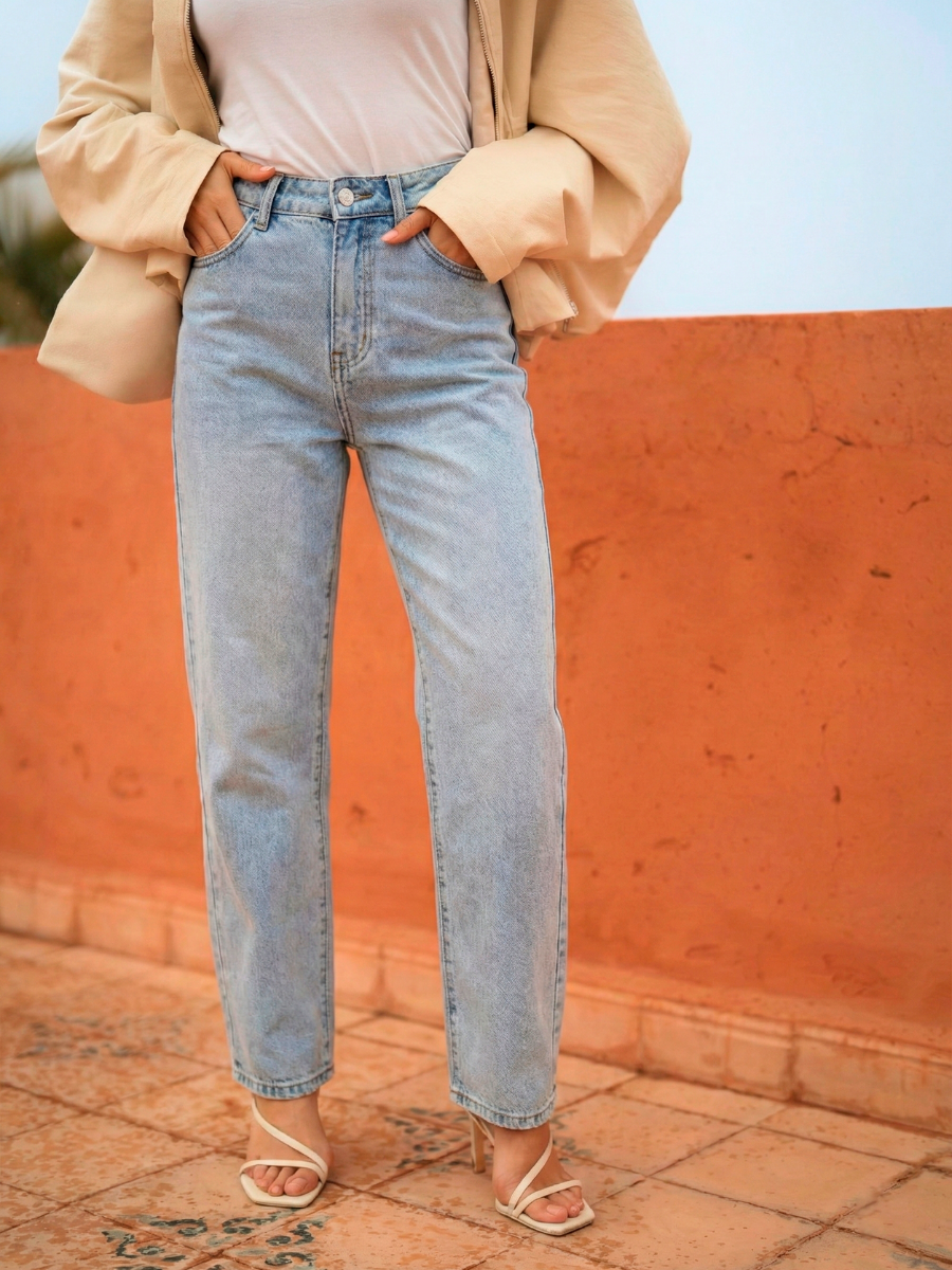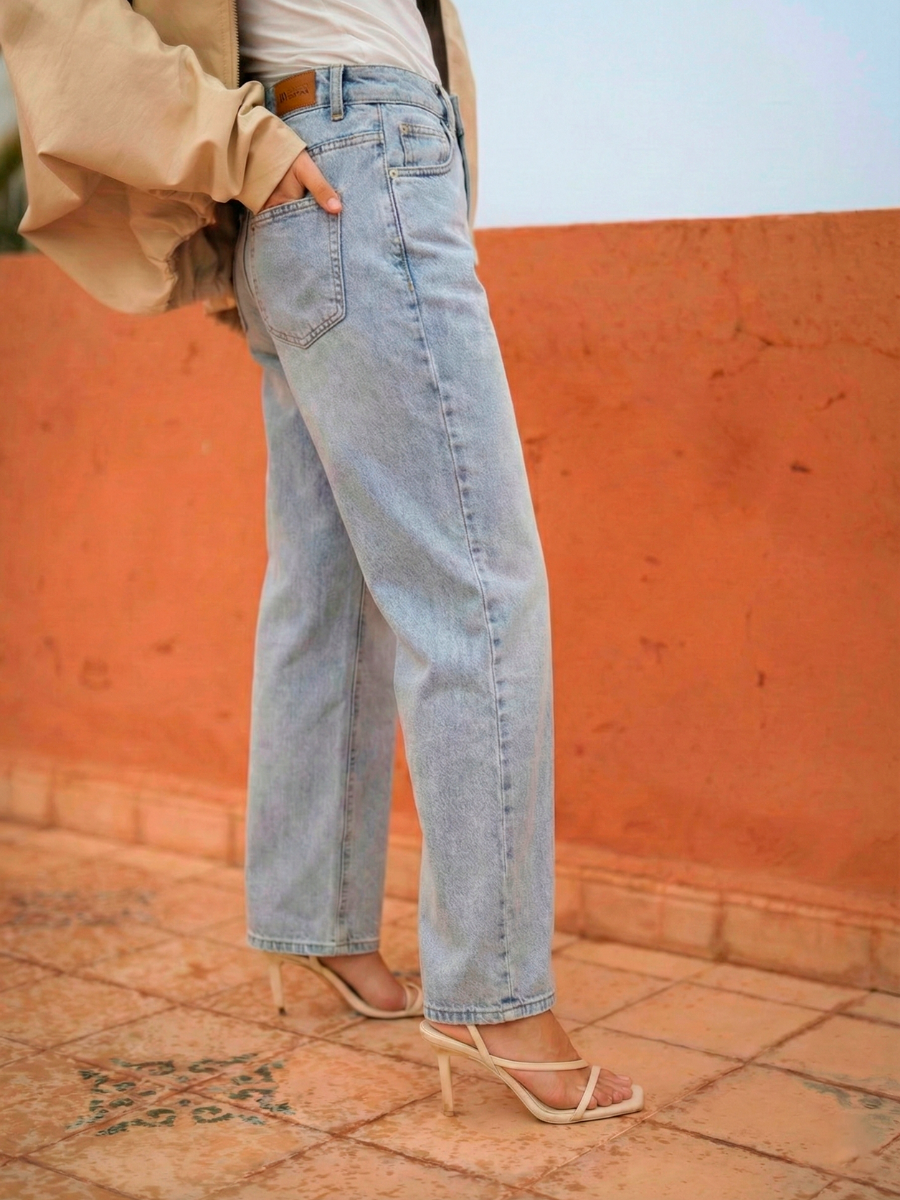 Jeans de cintura subida com perna larga e corte reto, concebidos para alongar a silhueta. O design clássico de cinco bolsos garante versatilidade e conforto no dia a dia.