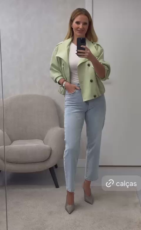 De corte estruturado e silhueta cintada, apresenta gola clássica com lapela, fecho frontal em zíper metálico dourado e botões de pressão decorativos no mesmo tom, que elevam o visual com um brilho subtil.