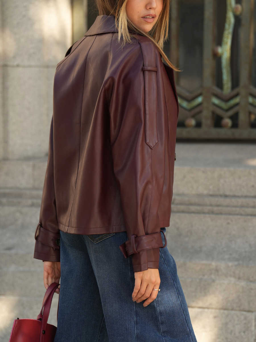 Blazer de corte reto em pele sintética com acabamento texturizado. Design minimalista, sem lapelas, com estrutura aberta à frente para um look elegante e versátil. Bolsos com pala e forro interior suave. Ideal para combinar com calças clássicas ou jeans, criando visuais urbanos com um toque sofisticado.