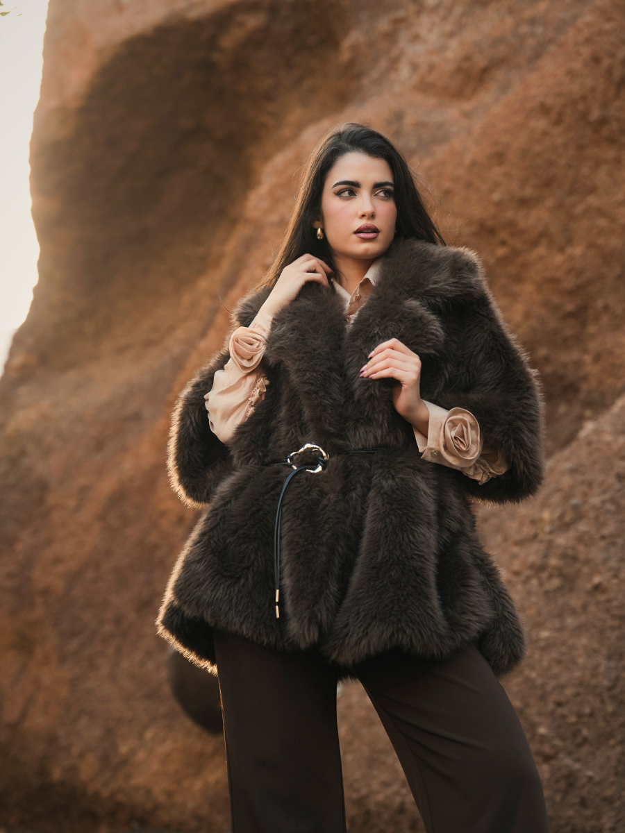 Casaco cem pelo macio com acabamento denso e ultra confortável. Modelo de corte reto com volume subtil, realçado por uma gola larga que acrescenta elegância e presença. Textura rica e uniforme em tom castanho, ideal para conjugar com peças clássicas ou dar contraste a coordenados urbanos. Forrado interiormente para maior conforto. Fecho frontal oculto. Dois bolsos frontais.
