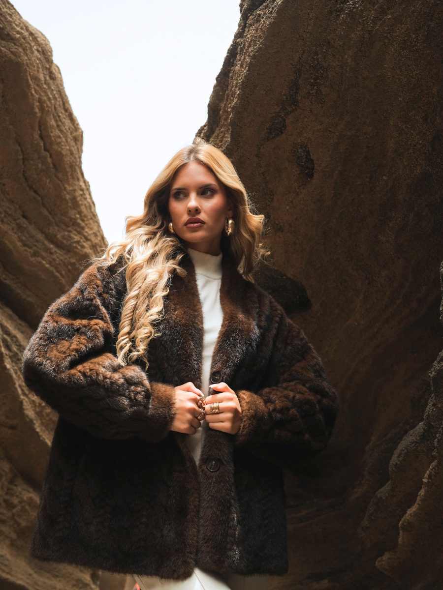 Casaco castanho em pelo com padrão entrançado, corte reto e comprimento médio. Modelo elegante com gola em bico e fecho com botões. Ideal para um look sofisticado de inverno. Dois bolsos frontais. Forro interior.