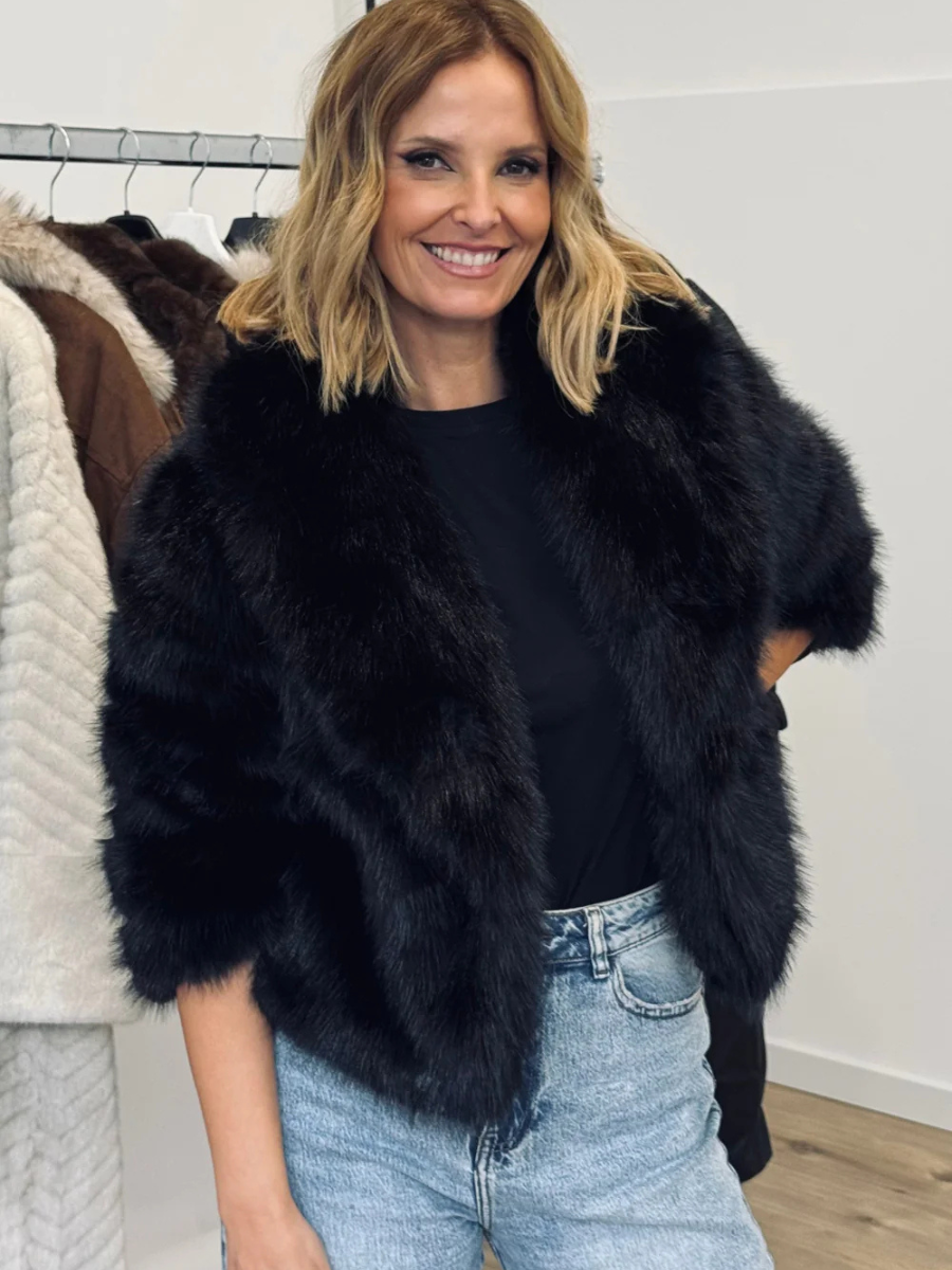 Casaco em pelo sintético textura longa e suave. Modelo oversized com capuz volumoso e fecho frontal metálico. Interior forrado e acabamento de alta qualidade. Ideal para coordenados urbanos e confortáveis nos dias mais frios. O detalhe do capuz confere um toque moderno à silhueta clássica.