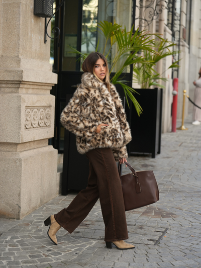 Casaco em pelo sintético com padrão animal print. Gola subida, corte reto e bolsos laterais embutidos. Fecho frontal com colchetes ocultos. Uma peça statement para os dias frios.