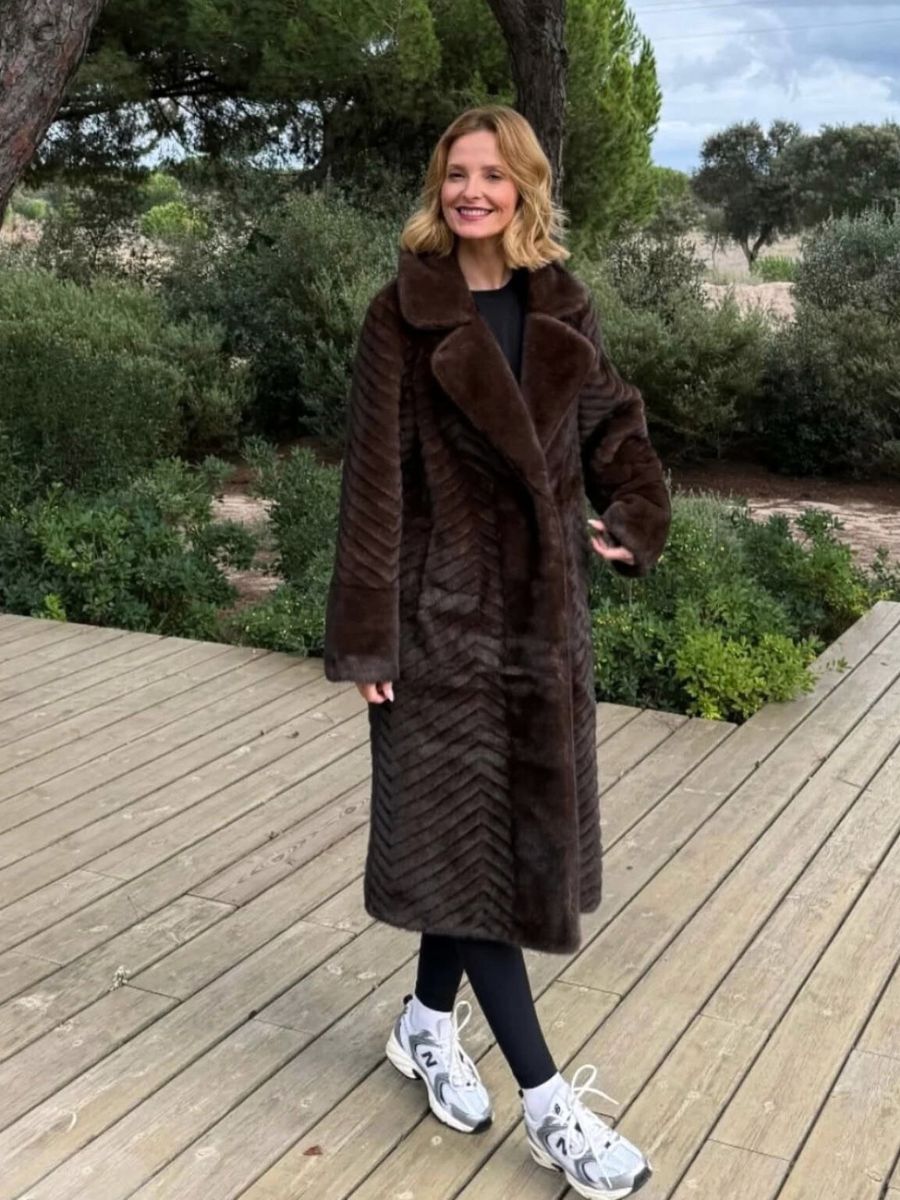 Sobretudo comprido em pelo sintético de alta qualidade, com textura ultra suave ao toque. Apresenta gola de lapela larga, ombros ligeiramente descaídos e corte reto que confere um ar sofisticado e moderno. O padrão em espinha, subtil mas elegante, acrescenta dimensão ao visual, enquanto o forro interior garante conforto térmico nos dias mais frios. Um modelo versátil que complementa tanto looks casuais como mais formais, ideal para usar sobre vestidos, malhas ou macacões.