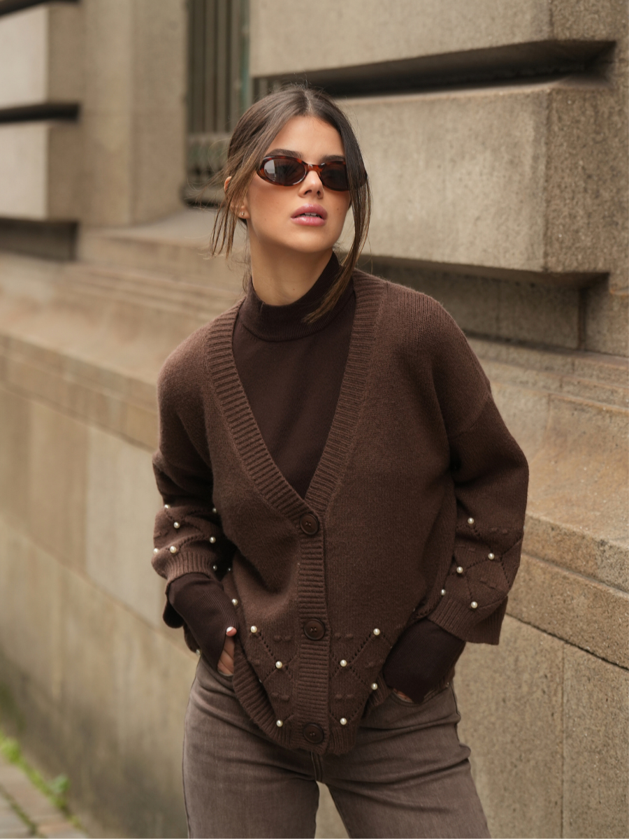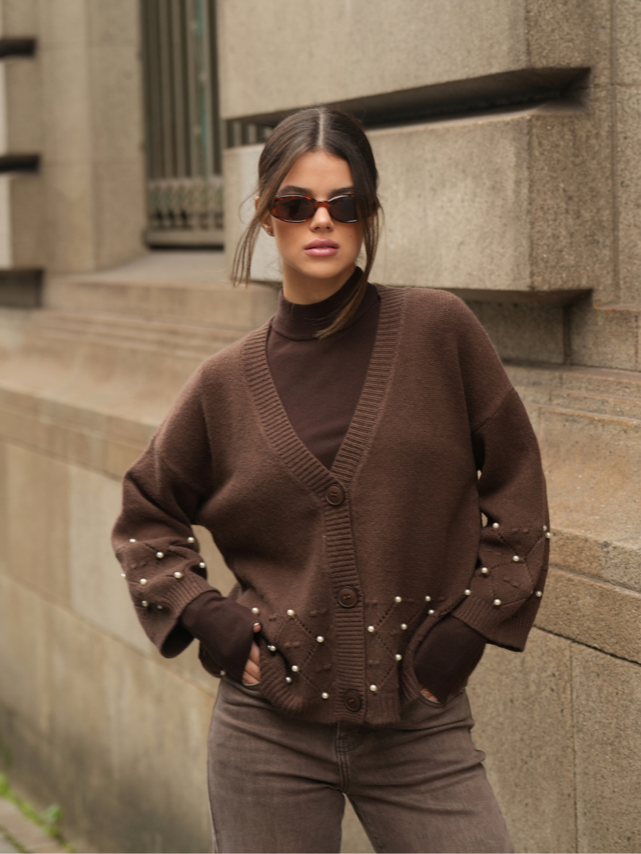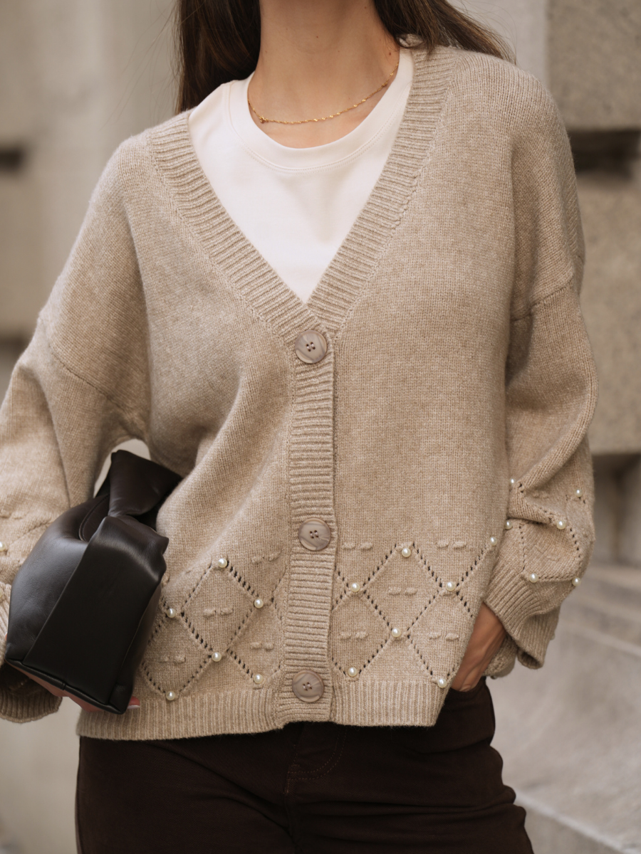 Cardigan de malha com decote em V, botões frontais e delicados bordados em padrão losango com aplicação de pérolas. Um modelo confortável e feminino, ideal para dias frios com um toque elegante.