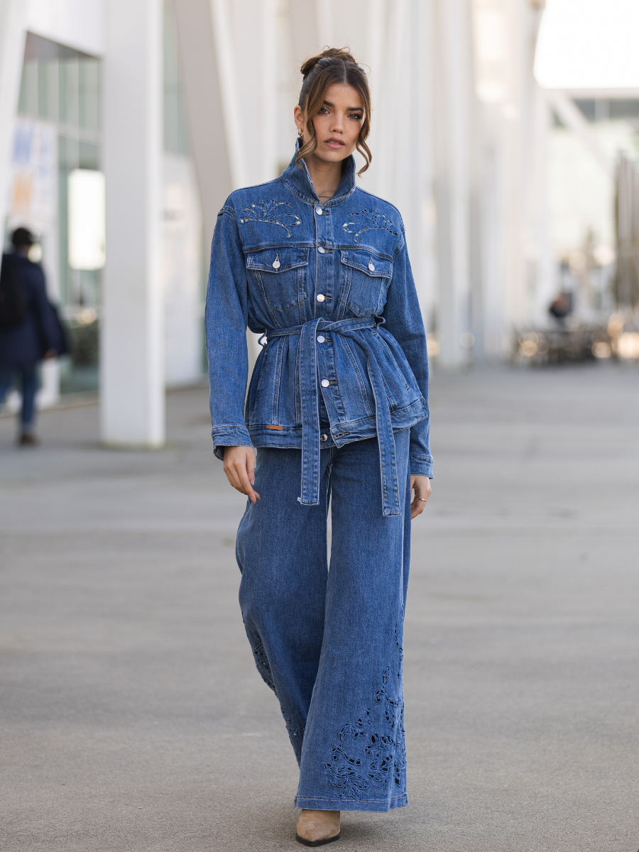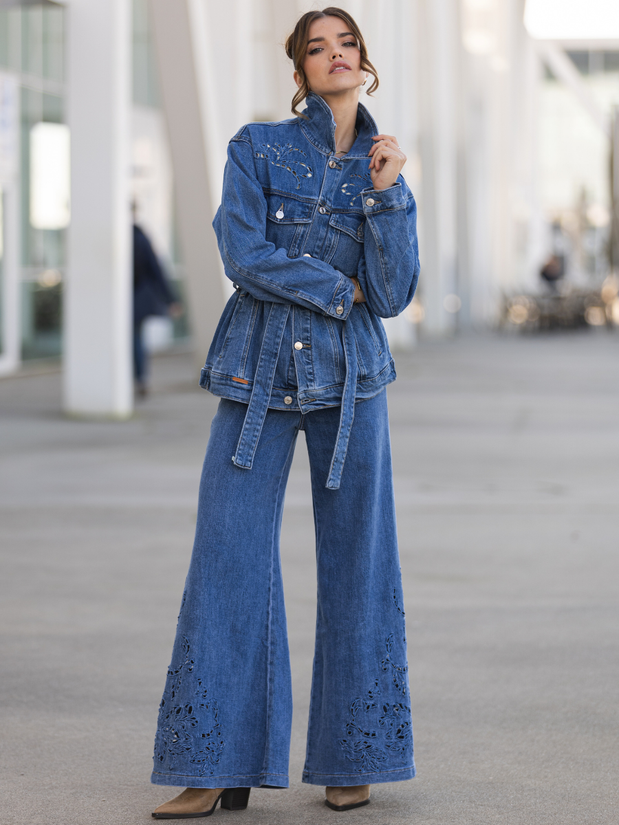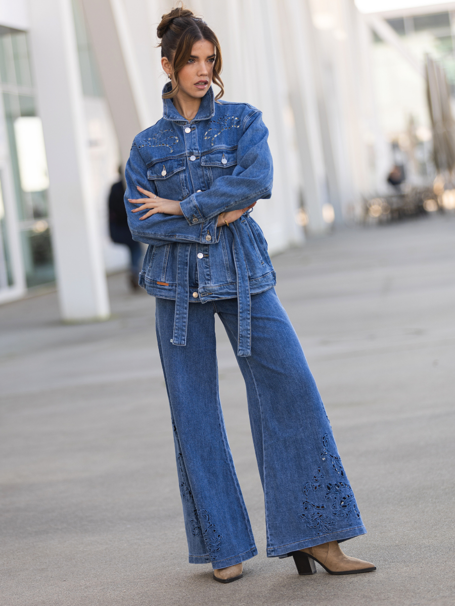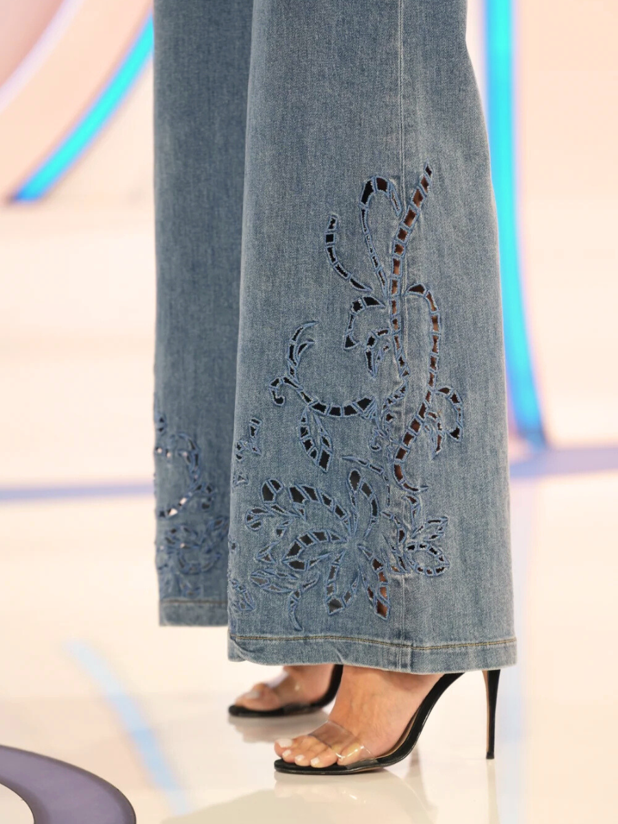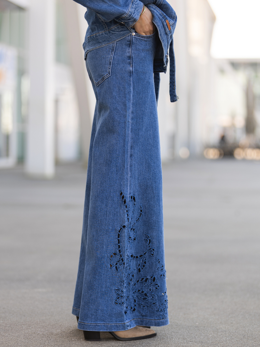 Calças de ganga em azul médio com corte wide leg. Apresentam cintura subida, bolsos frontais e traseiros funcionais e fecho com botão e fecho éclair. O destaque vai para os bordados vazados em padrão floral localizados na parte inferior das pernas — um detalhe delicado que transforma o básico em sofisticado.