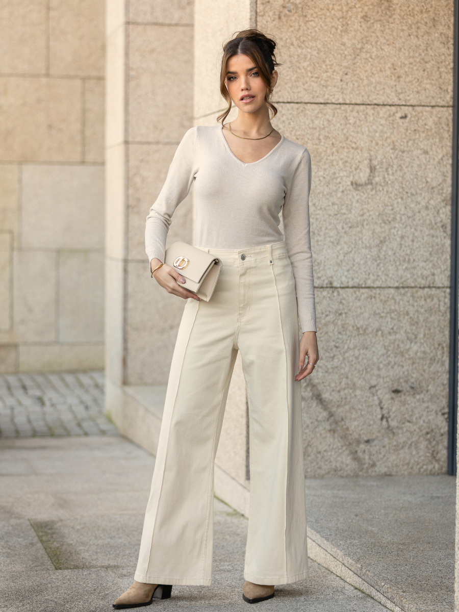 Jeans em tom bege claro com corte wide leg e cintura subida, ideais para um look sofisticado e moderno. Apresentam costura vincada ao longo da perna, criando um efeito de alongamento. Com dois bolsos de chapa na parte de trás e presilhas para cinto na cintura. Fecho frontal com botão metálico e fecho de correr oculto. Confeccionados em tecido de ganga confortável e estruturado, são perfeitos para combinar com camisas ou malhas em tons neutros.