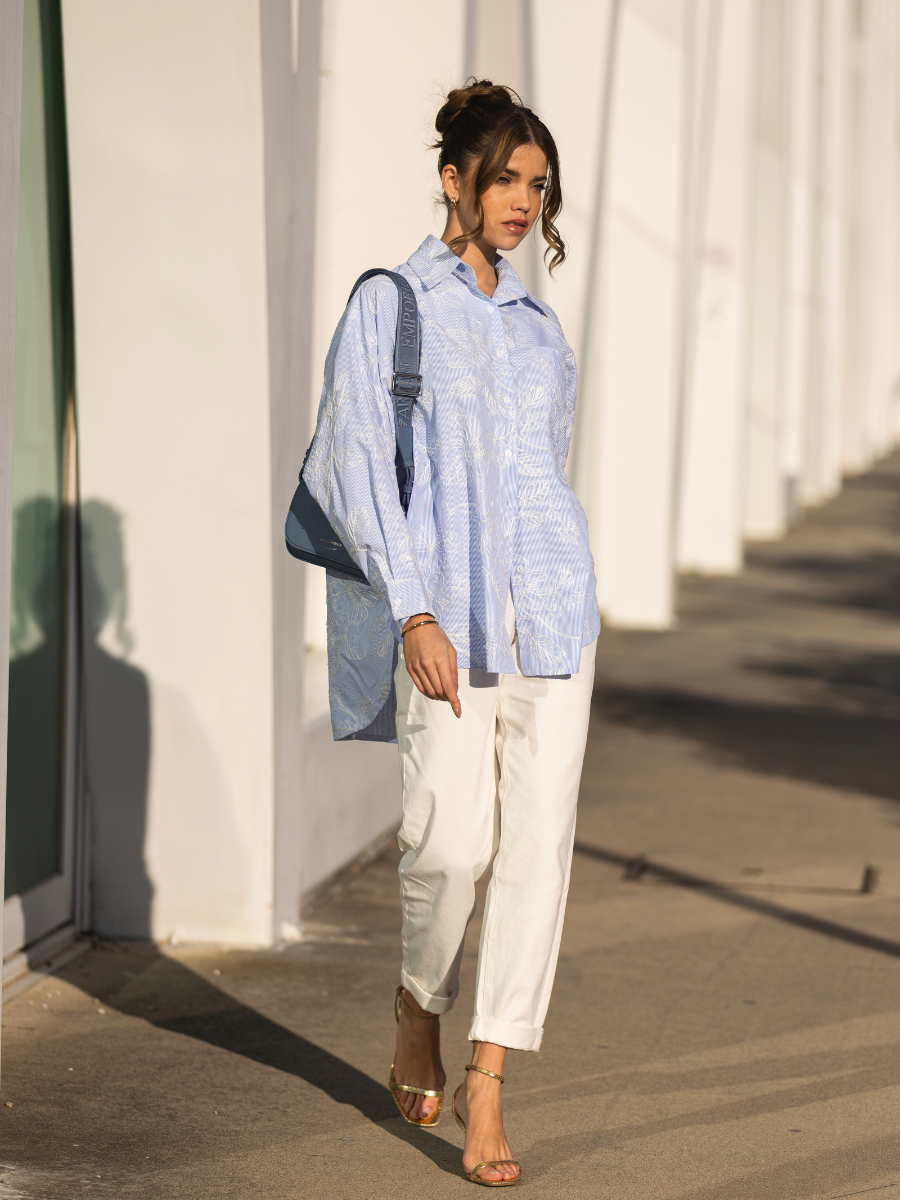 Estes jeans de corte wide leg destacam-se pela elegância descontraída e pelos detalhes únicos nas laterais. Confeccionados em ganga de lavagem azul média, combinam conforto e estilo com um toque artesanal. As aplicações metálicas formam pequenos padrões florais ao longo das costuras laterais, criando um visual sofisticado e inesperado. De cintura subida e com bolsos à frente e atrás, esta peça oferece uma silhueta alongada e moderna. Ideal para coordenar com tops justos ou blusas fluídas, para um look urbano com personalidade. O acabamento com rebites e pérolas adiciona textura e brilho na medida certa.