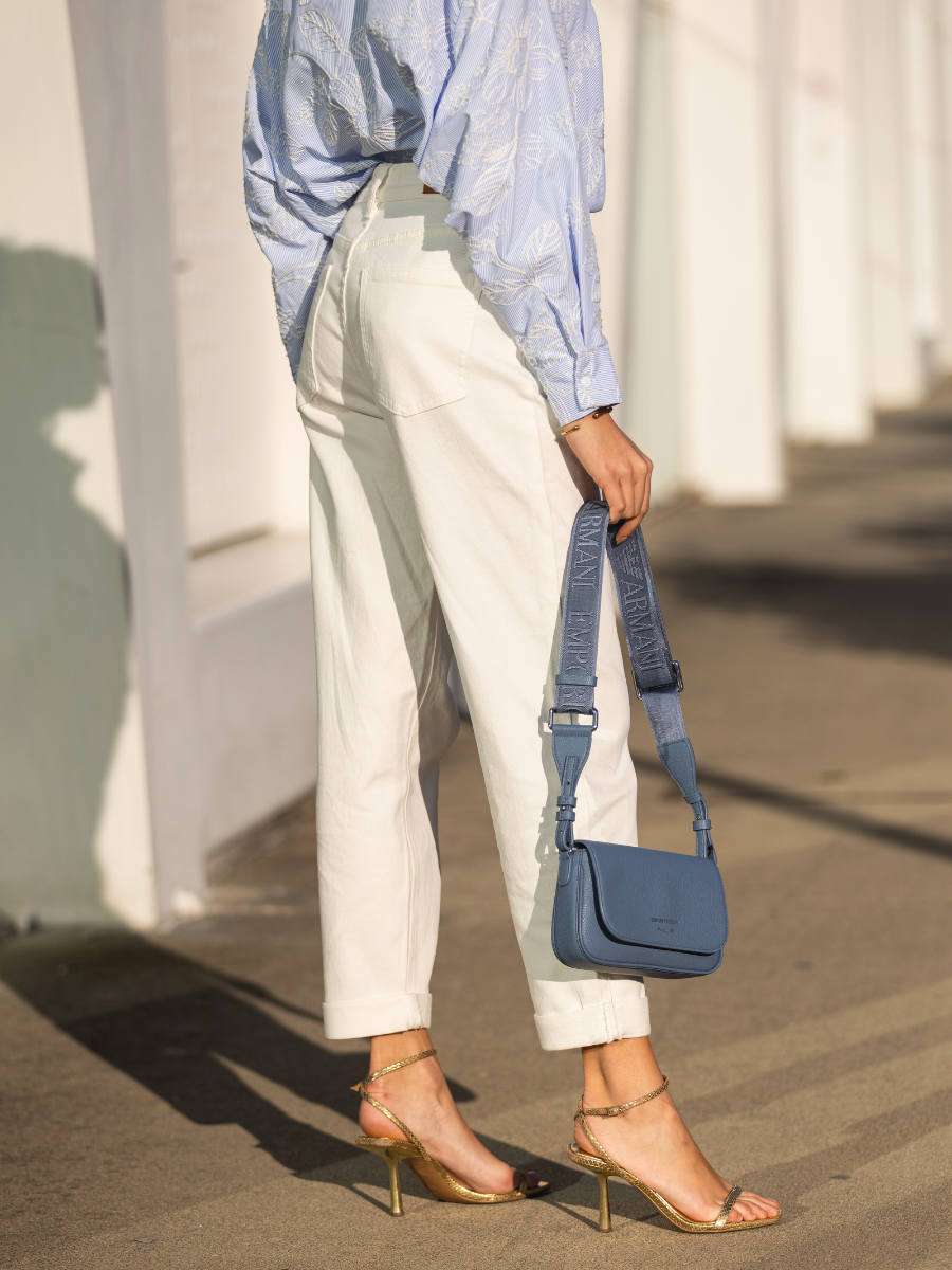 Calças de cintura subida confeccionadas em ganga de algodão com acabamento suave. Apresentam perna larga e corte estruturado que alonga a silhueta. O design inclui bolsos frontais e posteriores e fecho frontal com botão e fecho éclair. Uma peça contemporânea que combina facilmente com tops leves ou camisas para um look elegante e descontraído.