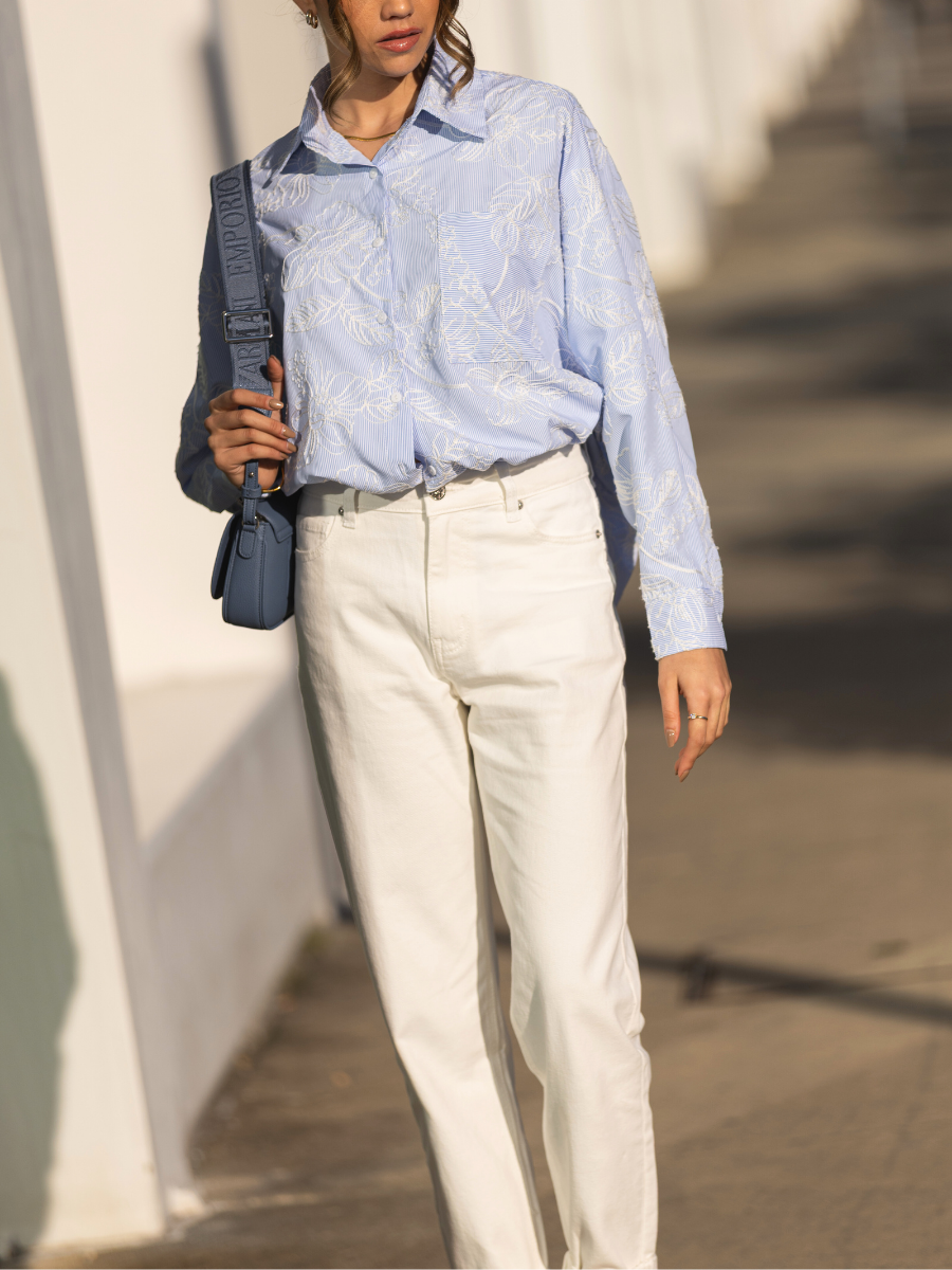 Jeans de cintura subida em ganga azul média, com corte reto e comprimento até ao tornozelo. Detalhe de aplicações de pérolas pequenas e agrupadas em forma de flor, distribuídas ao longo de toda a peça — à frente, nas laterais e parte de trás — criando um padrão delicado e sofisticado. Bainha simples e discreta. Bolsos frontais e traseiros funcionais. Fecha com botão metálico e fecho de correr.