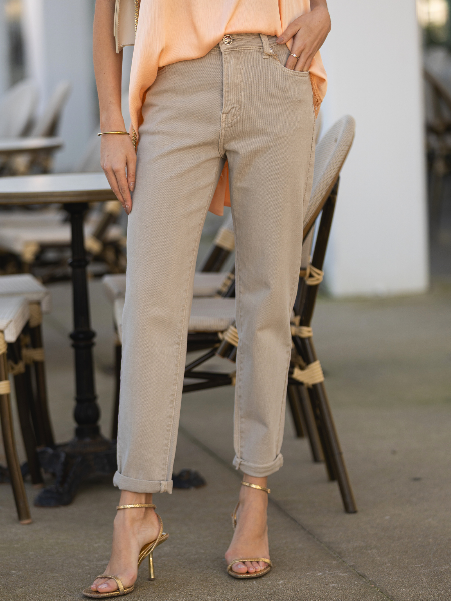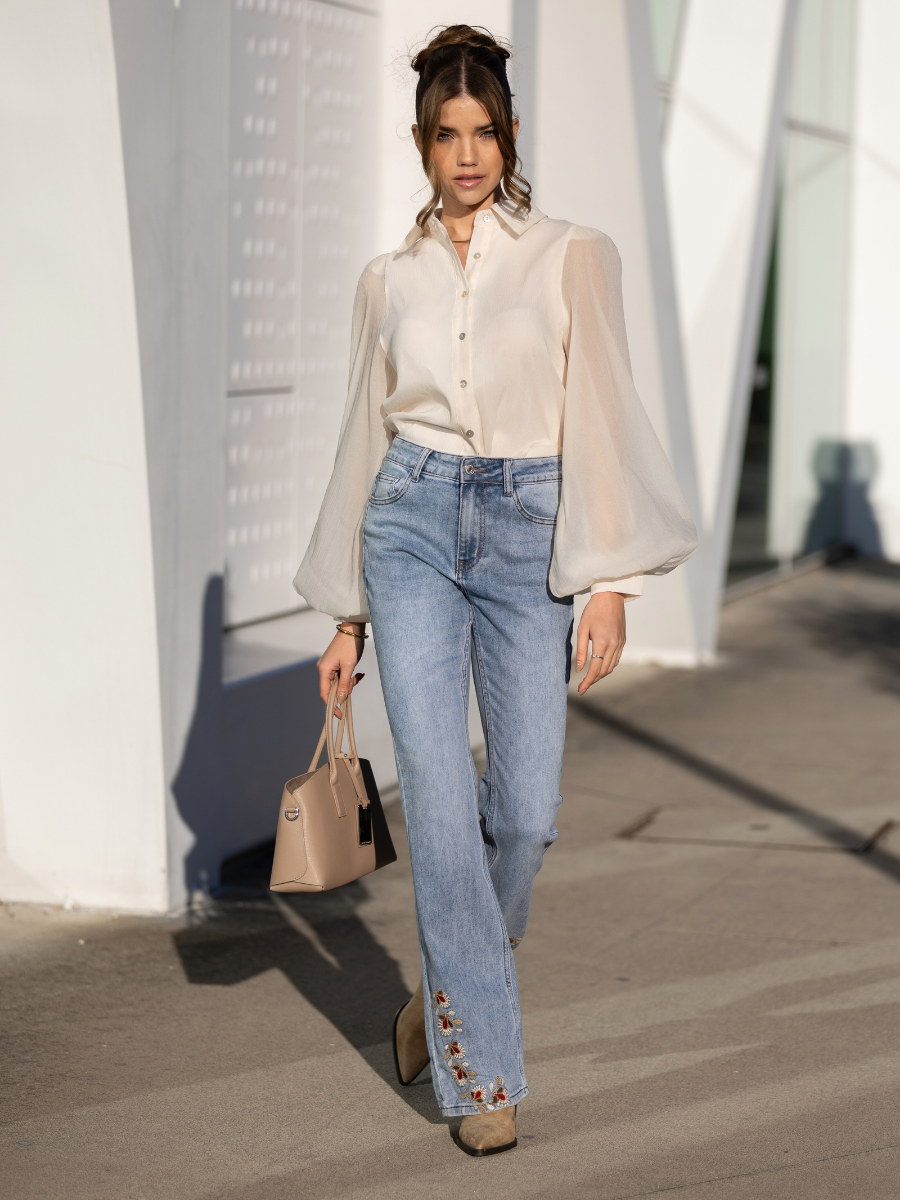 Jeans em ganga bege com acabamento liso, corte reto e perna larga. Modelo de cintura média com cinco bolsos, fecho de botão metálico e fecho éclair. O destaque vai para o delicado bordado floral em baixo-relevo na bainha, com recorte festonado que acrescenta feminilidade e sofisticação ao look. Um modelo versátil e elegante, ideal para coordenar com camisas leves ou malhas neutras.