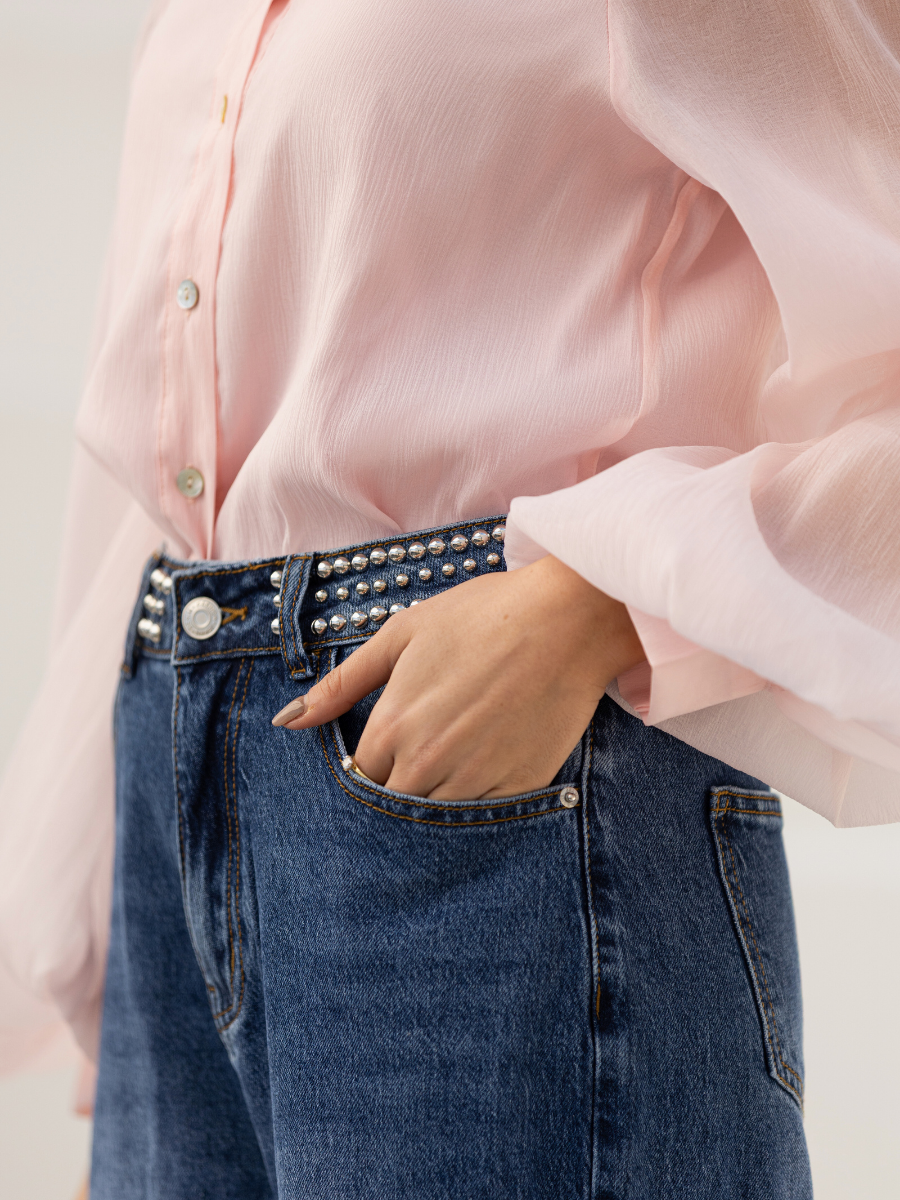 Calças de ganga com corte wide leg e cintura subida. O detalhe marcante está na aplicação de tachas prateadas ao longo do cós, criando um efeito visual impactante e moderno. Fecho frontal com botão metálico e fecho éclair. Modelo com bolsos frontais e traseiros funcionais. Um modelo statement que eleva qualquer look básico.
