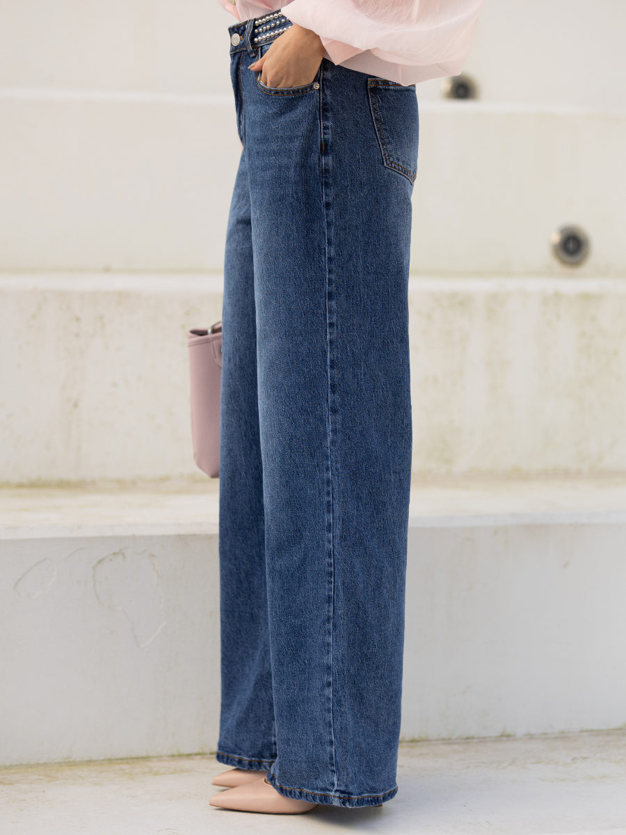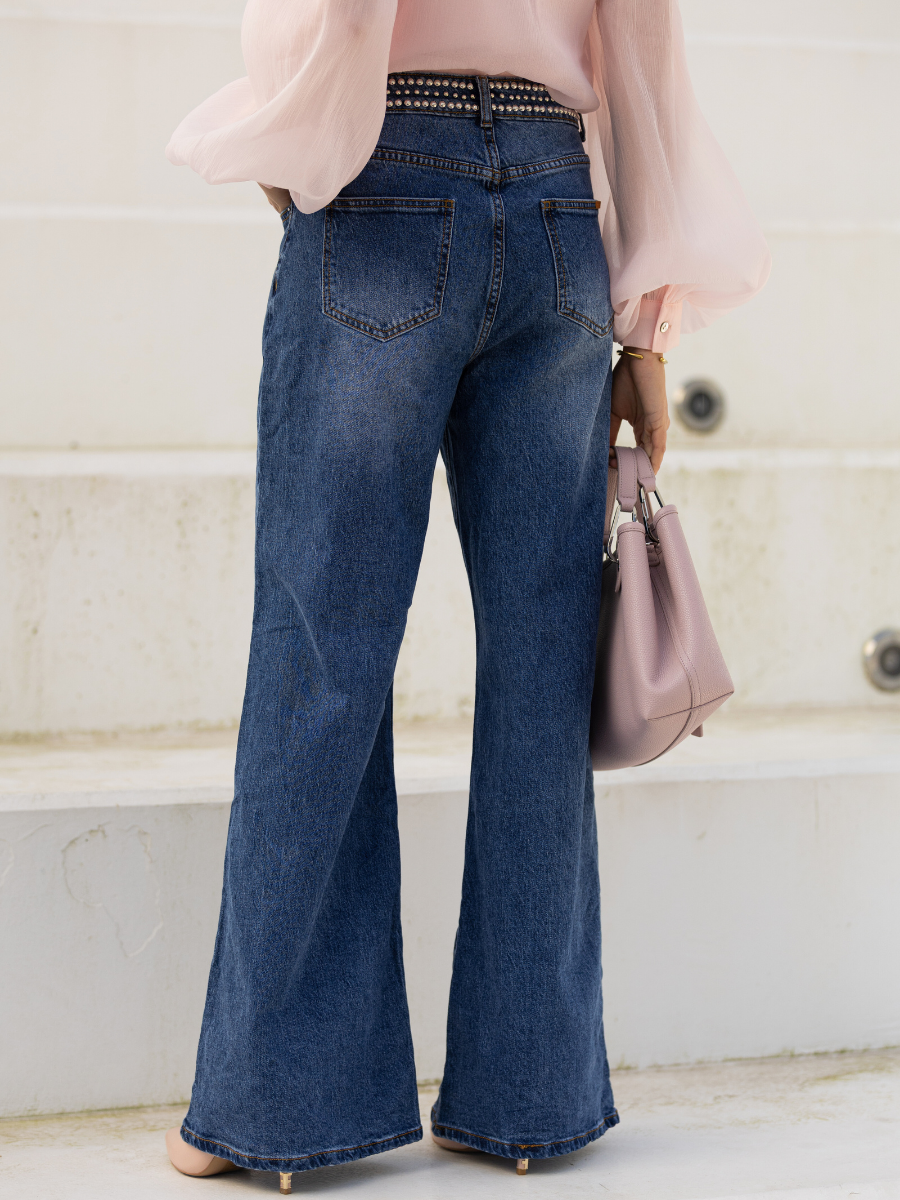 Jeans wide leg cintura c/ tachas