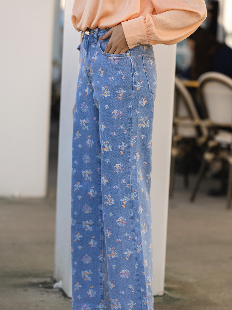 Calças de ganga de cintura subida com perna reta. Estampado floral em tons suaves por toda a peça. Modelo clássico com bolsos frontais e traseiros, passantes no cós e fecho frontal com botão metálico e fecho de correr. Um toque romântico e descontraído para o dia a dia.