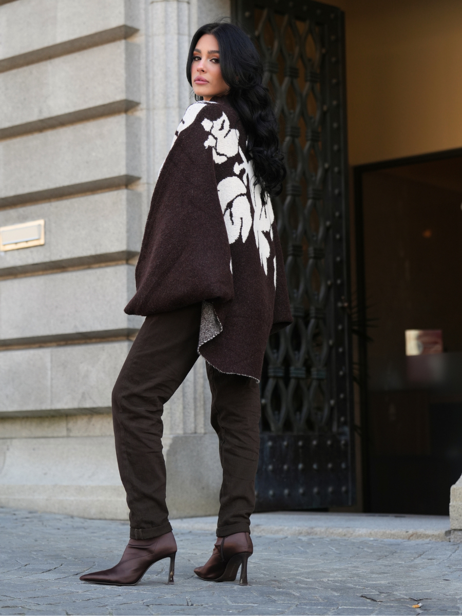 Camisola em malha castanha com padrão floral bege em relevo. Com gola subida canelada e corte assimétrico, esta peça destaca-se pelas mangas largas e pelo seu visual aconchegante e sofisticado. Um camisolão confortável, perfeito para os dias frios da estação, com um toque marcante graças ao contraste do padrão botânico. Ideal para conjugar com calças de corte reto ou leggings para um look urbano e descontraído.