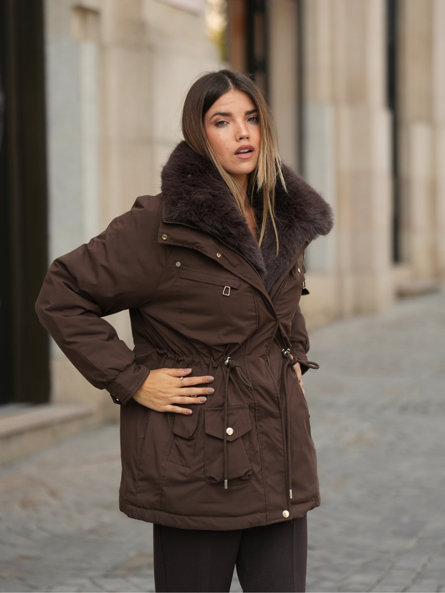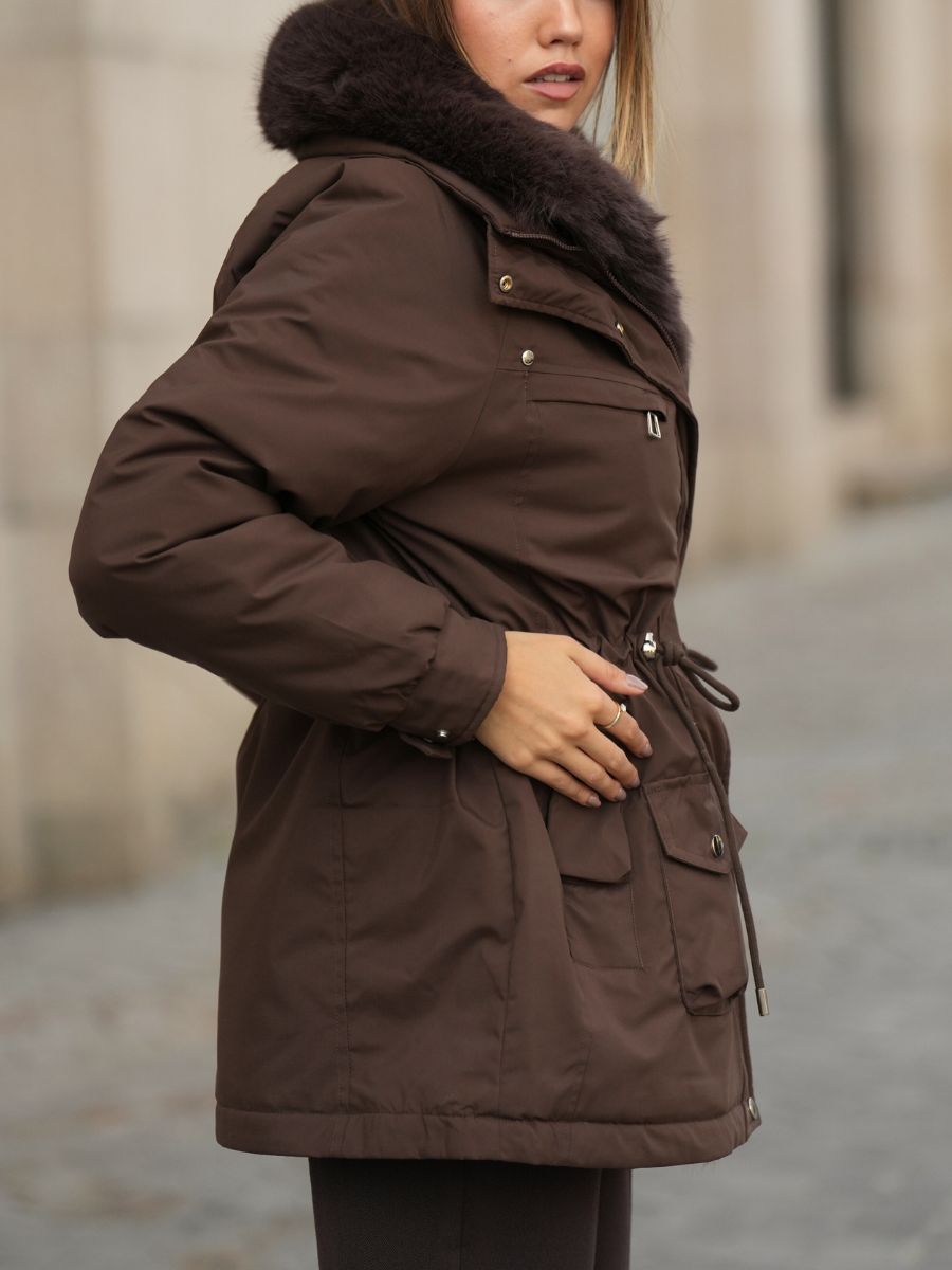 Casaco acolchoado em tecido técnico, com gola ampla em pelo sintético ultra suave. Modelo com fecho de correr e botões de pressão à frente, bolsos com aba e cordão interior ajustável na cintura, que permite marcar a silhueta. Capuz embutido na gola. Uma peça prática, quente e sofisticada — perfeita para enfrentar os dias frios com estilo.