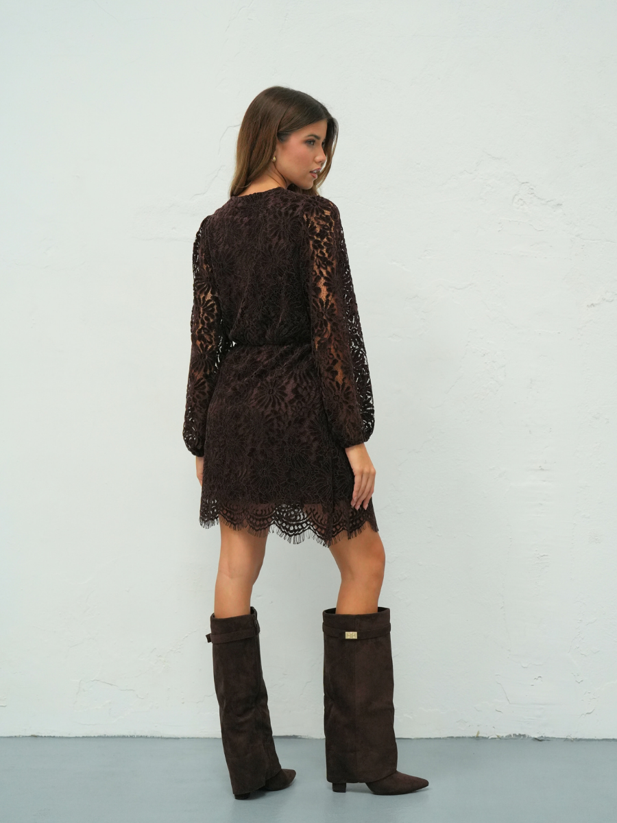 Vestido curto em renda trabalhada, com padrão floral em relevo que adiciona textura e sofisticação. O modelo apresenta decote em V cruzado, que valoriza o colo de forma elegante, e cintura ligeiramente subida, criando uma silhueta feminina e alongada. As mangas compridas equilibram o design e tornam-no perfeito para ocasiões especiais nos dias mais frescos. O forro interior oferece conforto e discrição, enquanto o acabamento rendado na bainha e punhos dá um toque delicado e requintado.