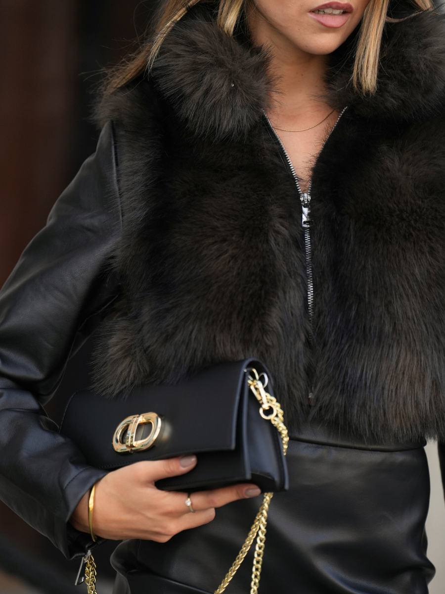 Blusão curto com gola ampla de pelo macio. Modelo com fecho de correr frontal, mangas longas e acabamento ligeiramente estruturado. A gola e o peito em pelo conferem um contraste sofisticado e textura aconchegante. Uma peça statement que alia estilo urbano e elegância.