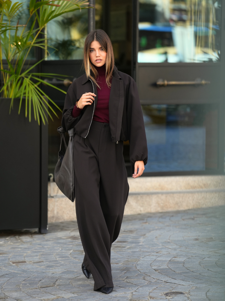 Calças de corte largo com pinças frontais e cintura média com passantes. Perna ampla e fluída, com um caimento elegante que favorece a silhueta. Fecho com botão e braguilha de correr. Uma escolha sofisticada para usar com camisolas justas ou camisas fluidas.