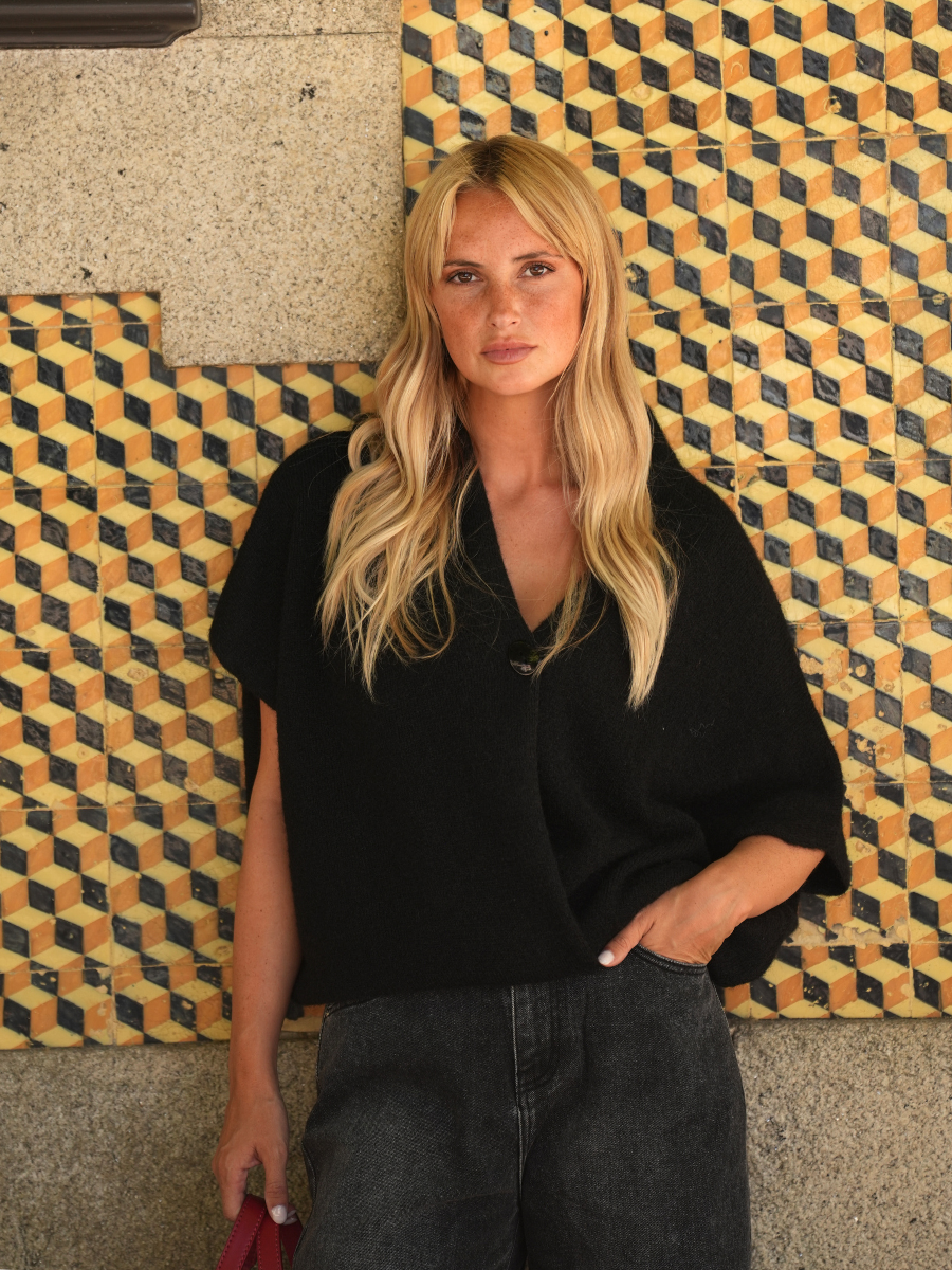 Cardigã em malha suave, corte oversized e manga curta ampla. Design minimalista com fecho de botão único à frente. O equilíbrio ideal entre conforto e sofisticação. Casaco leve meia-estação