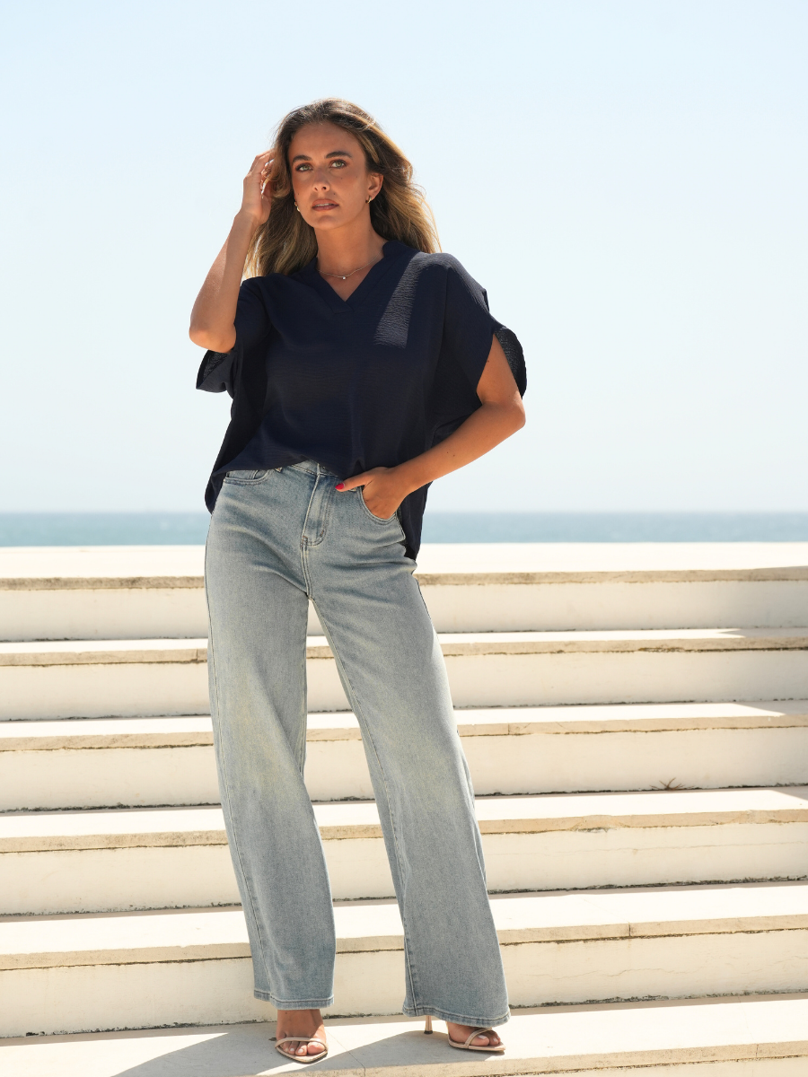Jeans de corte largo para mulher, com cintura subida e lavagem clara. Design com cinco bolsos, fecho de botão e braguilha com fecho éclair. Perfeito para looks descontraídos ou sofisticados. Ideal para primavera e verão.