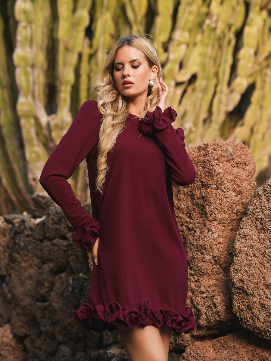 Vestido de manga comprida com detalhe de folhos estruturados no punho e na bainha. Corte fluido e elegante, perfeito para ocasiões especiais. Disponível em bordeaux e preto.