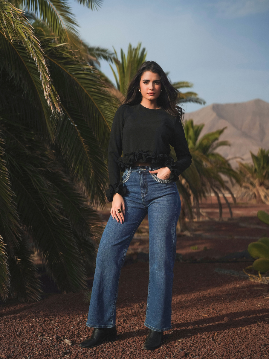 O tom de ganga azul proporciona um contraste elegante com os detalhes aplicados, permitindo conjugar com camisas fluídas, blusas românticas ou peças mais estruturadas. A perna ampla alonga a silhueta e garante conforto em qualquer momento do dia