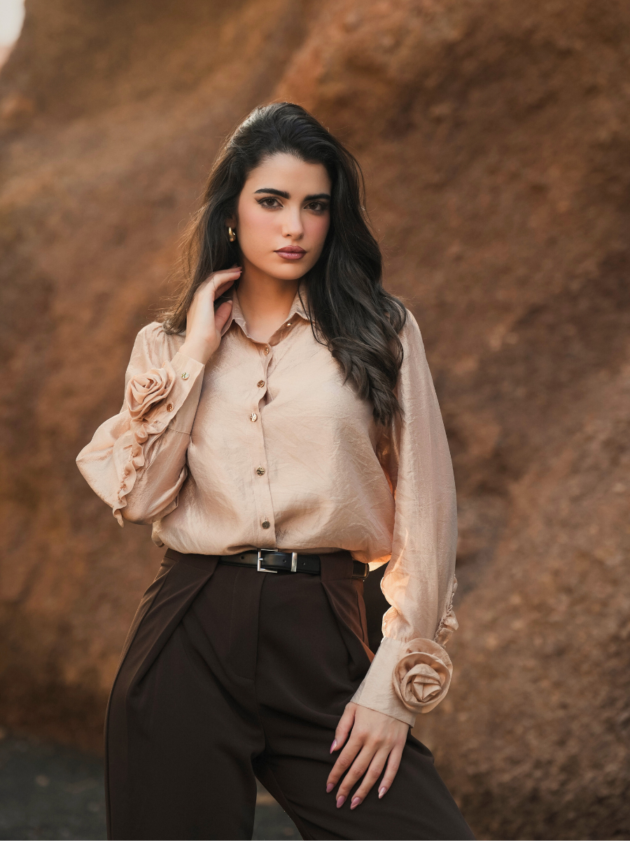 Blusa feminina em tecido translúcido com leve textura e acabamento acetinado. Modelo com gola de camisa clássica e botões dourados frontais. As mangas longas em balão destacam-se pelos punhos com aplicação de rosa em tecido e pequenos folhos que percorrem o comprimento do punho até ao cotovelo. Um detalhe delicado e feminino que transforma esta peça numa escolha sofisticada. Forro interior.