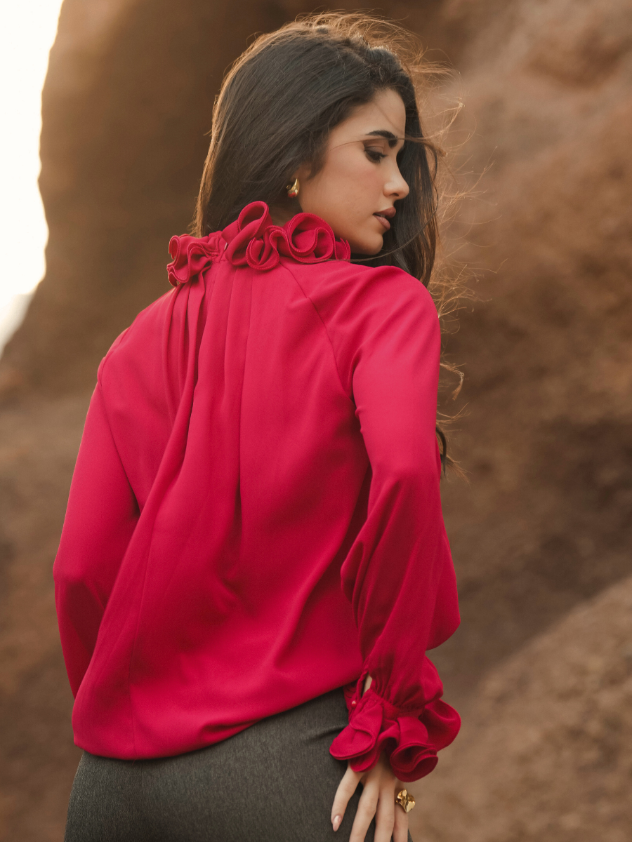 Blusa fluida com gola subida adornada com folhos. Modelo de manga comprida com punhos elásticos e detalhe ondulado. Corte solto, com leve franzido à frente para um caimento elegante. Disponível em vermelho e preto. Um essencial sofisticado para elevar qualquer coordenado.