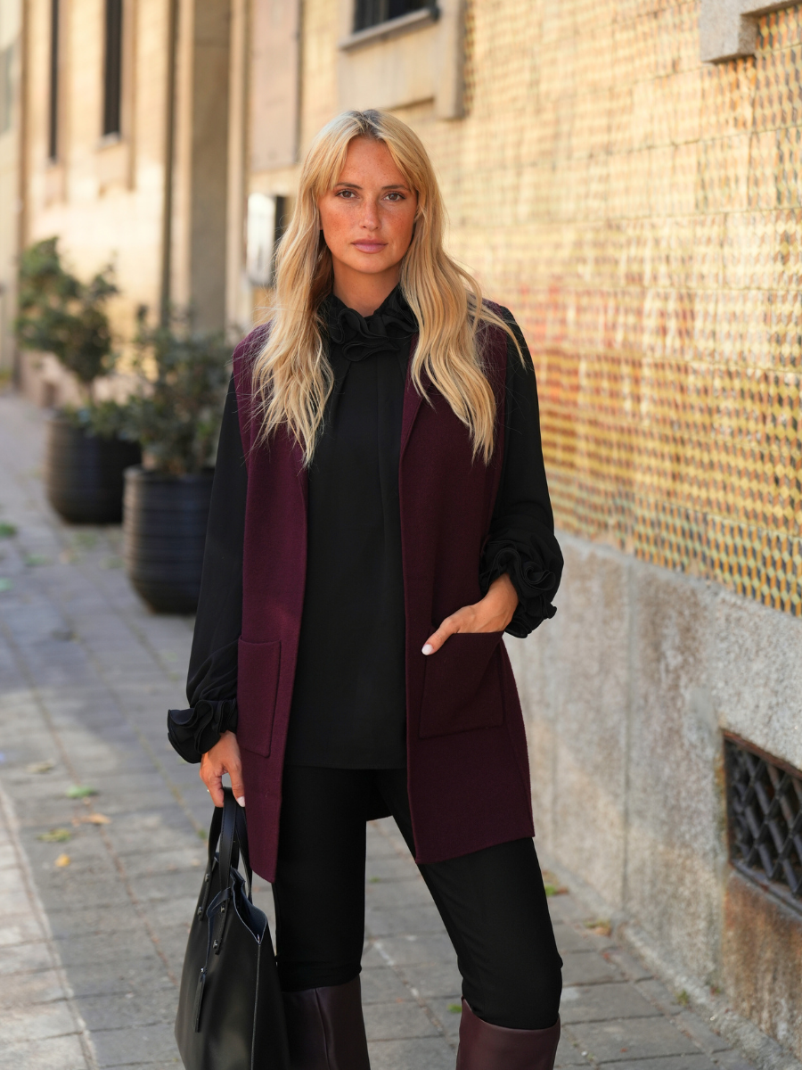Colete comprido em malha suave, com corte reto e gola de lapela. Modelo sem mangas, com dois bolsos frontais aplicados e detalhe de costura pespontada. Estrutura leve, ideal para sobrepor em camisas, blusas ou vestidos. Fecho frontal com botão interior decorativo (modelo da segunda versão).