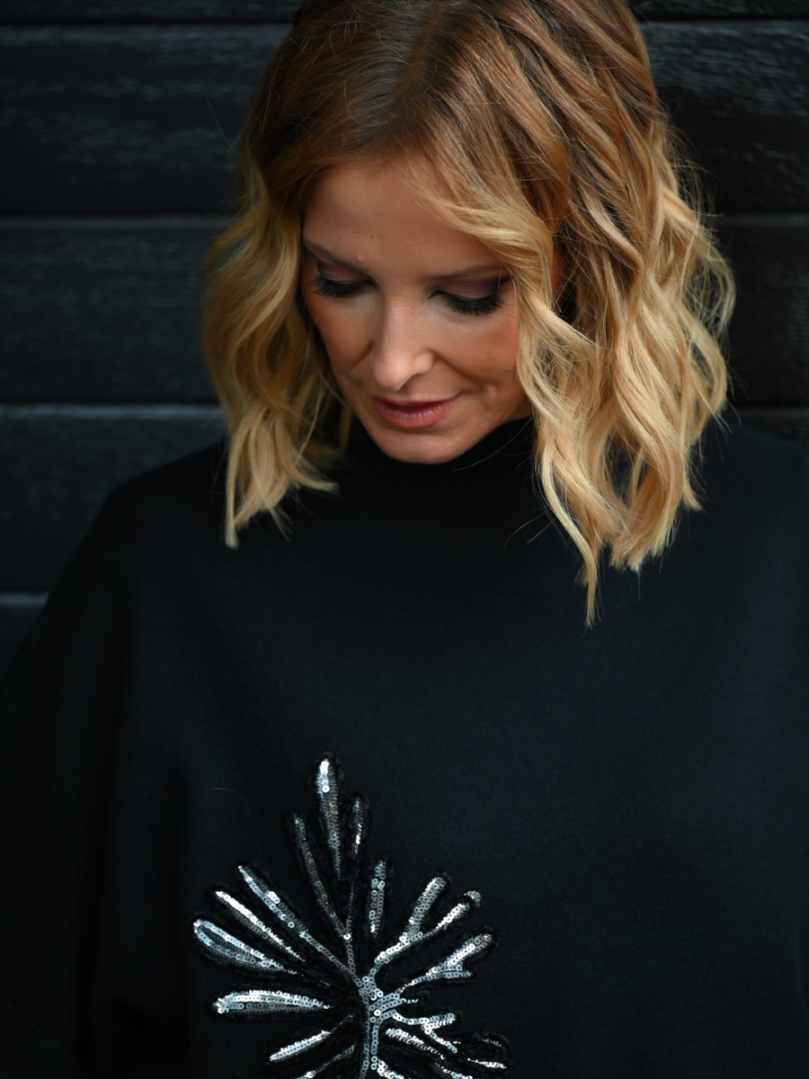 Camisola oversized em malha suave com manga curta dobrada. Gola subida e detalhe bordado com lantejoulas em forma de flor na frente.