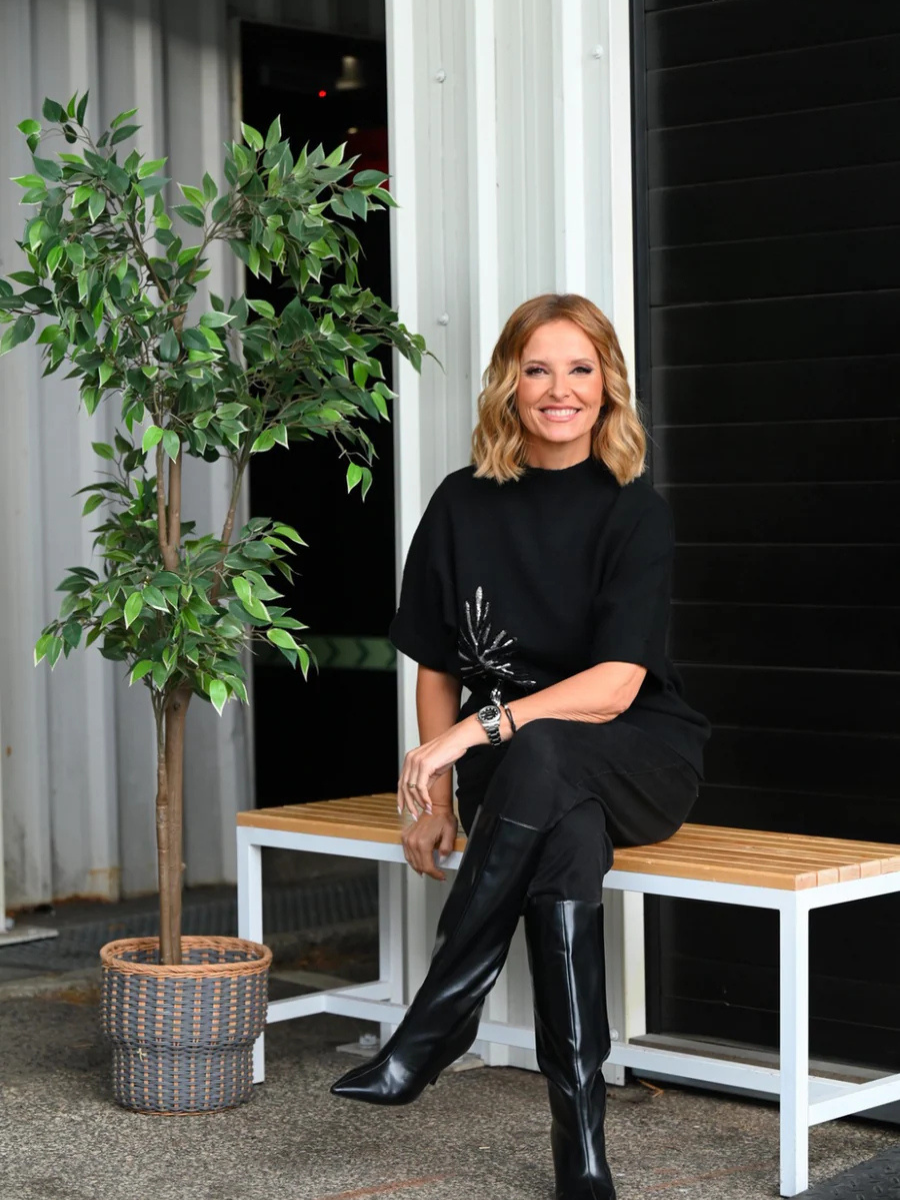 Conjunto composto por camisola e saia em malha estruturada. A camisola tem manga comprida com ombros ligeiramente marcados e aplicações florais volumosas nos punhos e na base, fecho embutido. A saia destaca-se pelo mesmo acabamento floral aplicado na cintura e bainha, criando um efeito sofisticado e harmonioso. Fecho embutido. Um coordenado marcante e feminino, perfeito para ocasiões especiais ou para looks ousados com impacto.