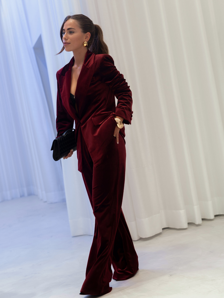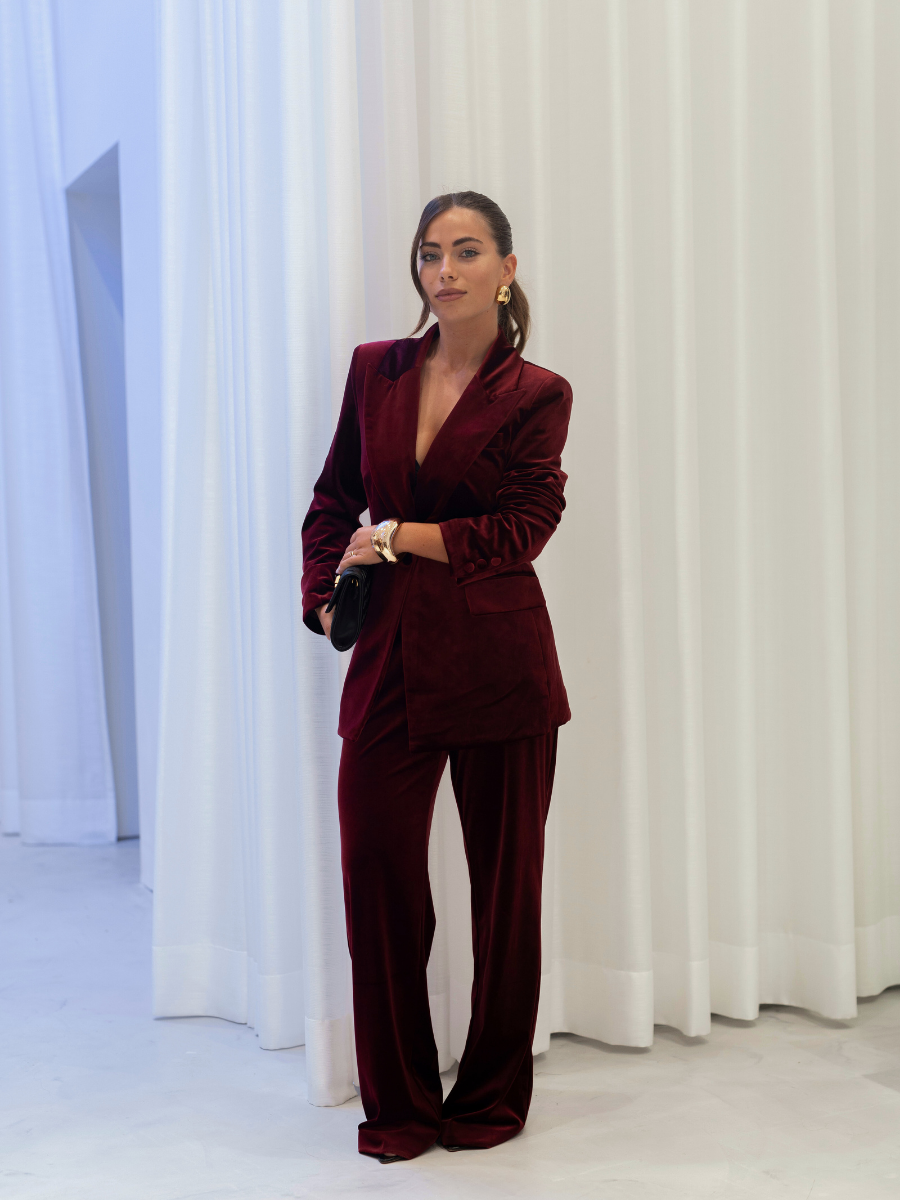 O blazer apresenta um corte cintado e gola de lapela clássica, ideal para destacar a silhueta com elegância. Blazer em veludo. Fit Slim. Decote em V. Mangas compridas. Ombros acolchoados. Fecha com botão. Bolsos laterais. Forro interior. As calças de perna reta alongam a figura e garantem um caimento fluido e confortável. Perfeito para eventos especiais ou para elevar um look noturno com charme e ousadia.