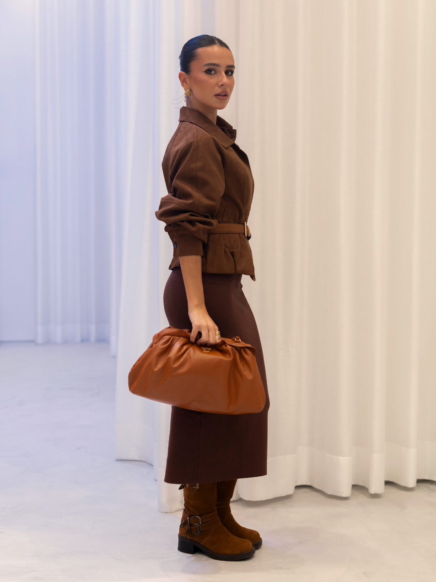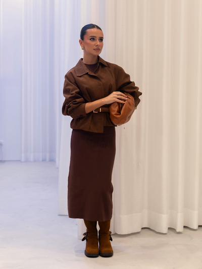 Conjunto em malha leve e confortável, composto por camisola de corte oversize e saia midi. A camisola apresenta decote em V e mangas amplas com rachas laterais, criando uma silhueta fluida e descontraída. A saia de cintura subida tem corte reto e cós elástico, garantindo um ajuste prático e elegante. Ideal para um look casual e urbano, com um toque sofisticado — combina na perfeição com ténis ou sandálias rasas.