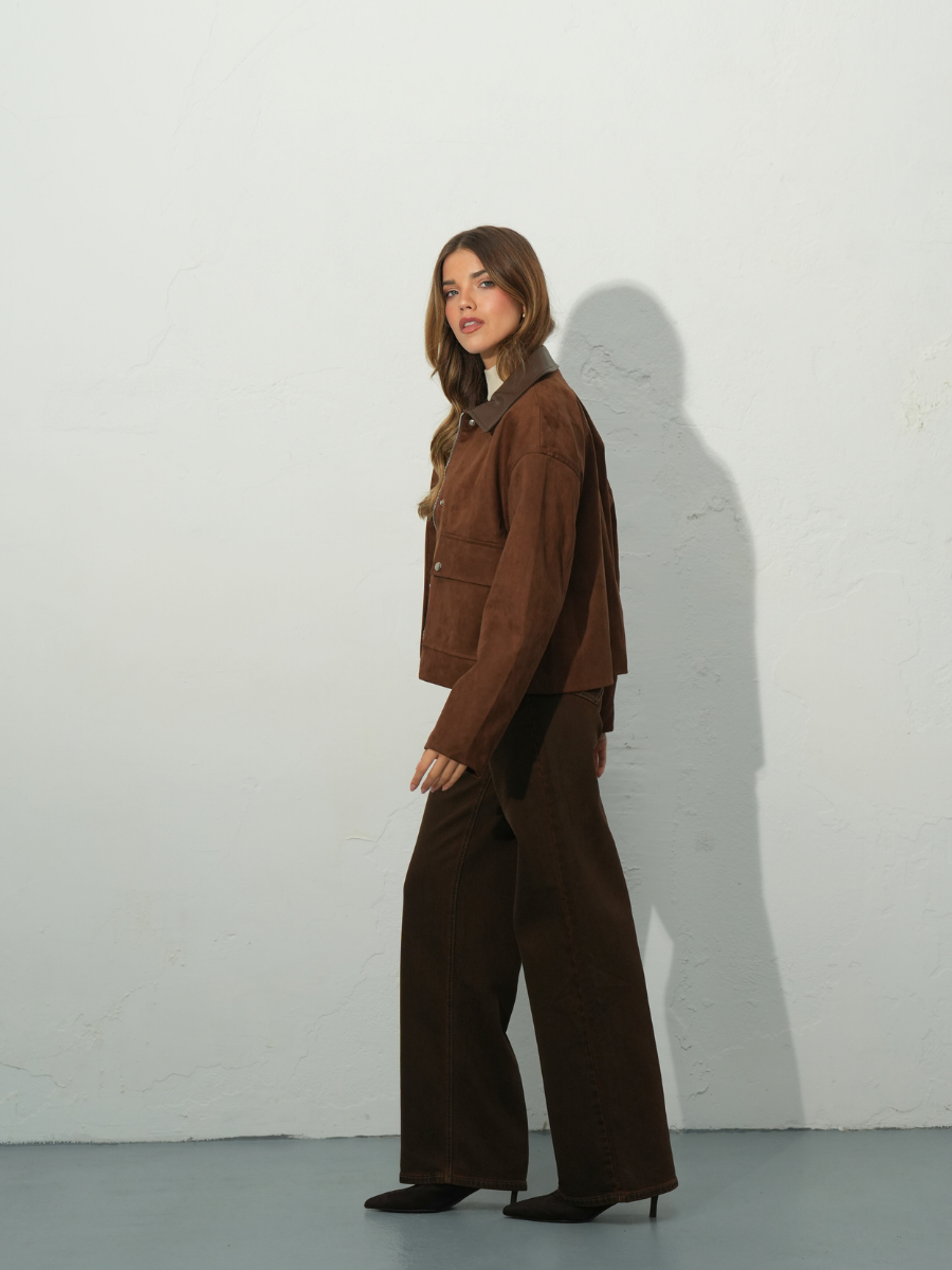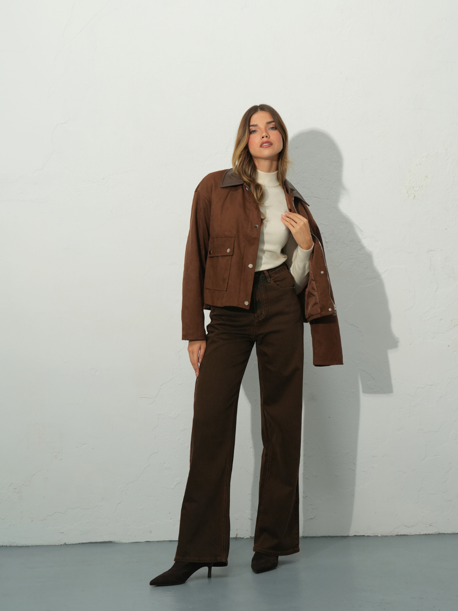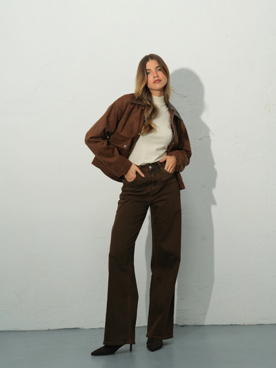 Um clássico renovado para os dias de outono. Estas jeans de perna larga destacam-se pelo tom castanho quente e pela estrutura fluída que alonga a silhueta. Com cintura subida, bolsos traseiros e detalhe de costura em contraste, são ideais para conjugar com camisas fluídas ou malhas justas. O corte reto a partir da anca proporciona um equilíbrio perfeito entre conforto e elegância, enquanto o tecido com ligeira elasticidade garante liberdade de movimentos. Versáteis e sofisticadas, adaptam-se tanto a looks de escritório como a coordenados urbanos com botas de salto.