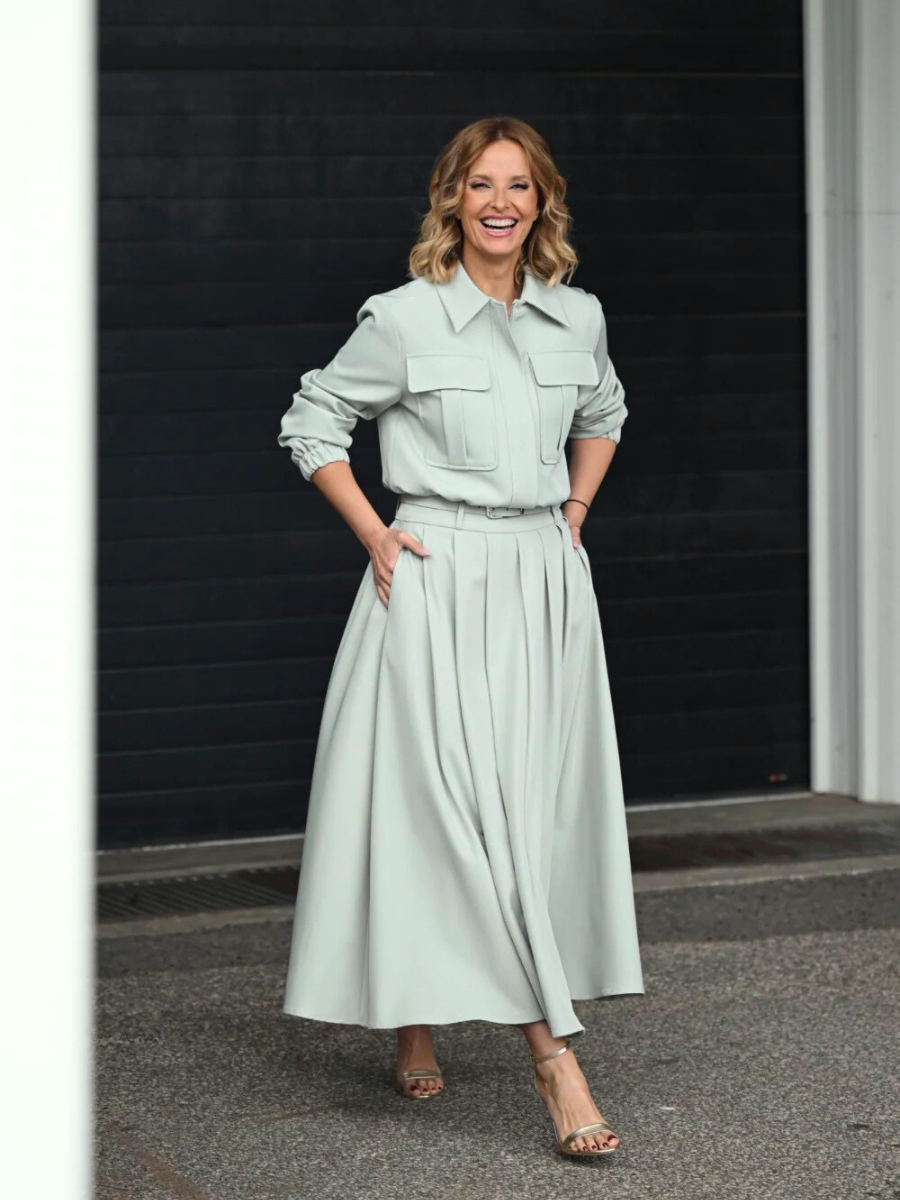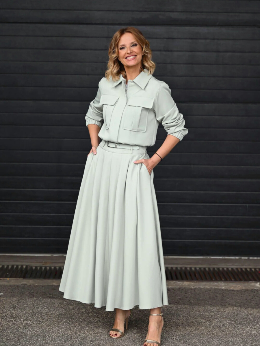 Saia midi de corte fluido com design minimalista e elegante. A cintura subida valoriza a silhueta, enquanto o volume suave cria um movimento leve e feminino. Ideal para combinar com o casaco a condizer ou com peças mais simples, adaptando-se facilmente a diferentes ocasiões.